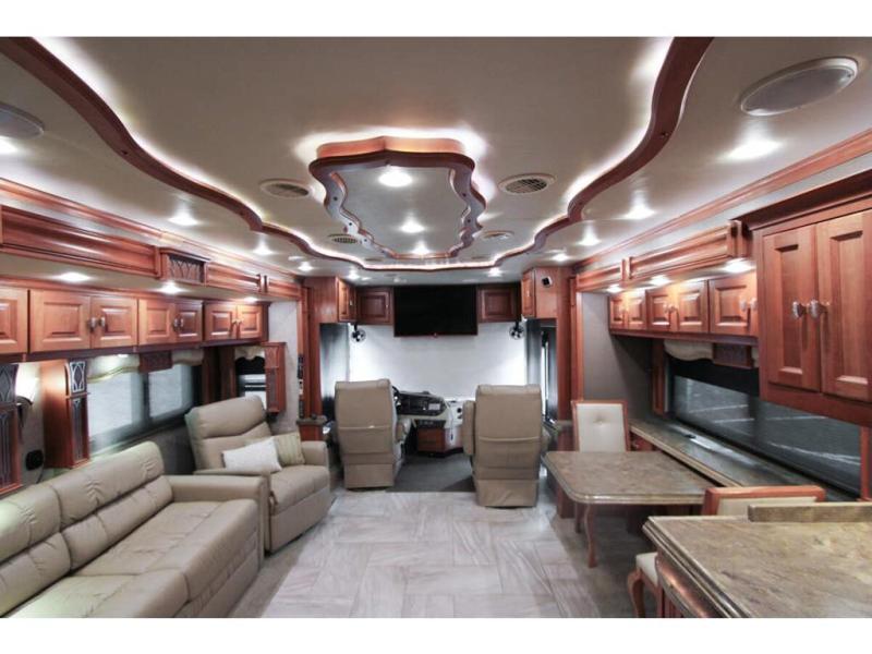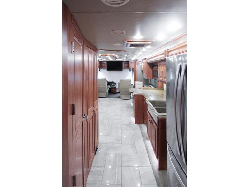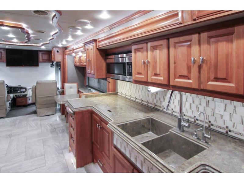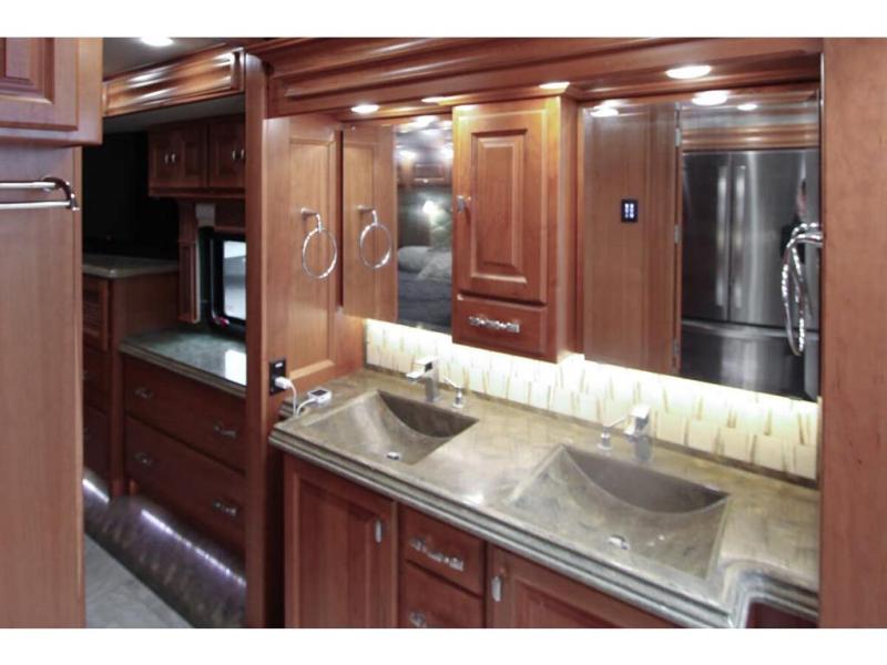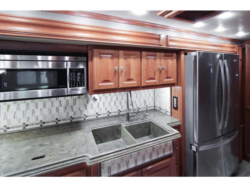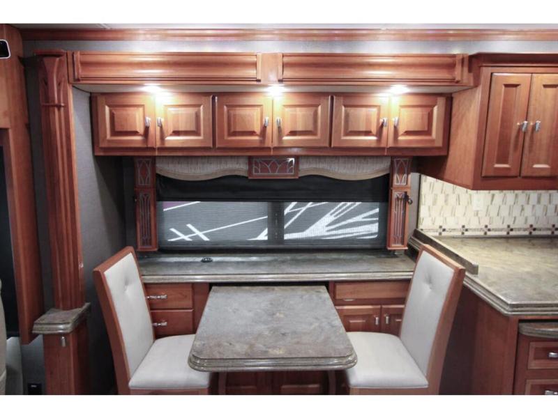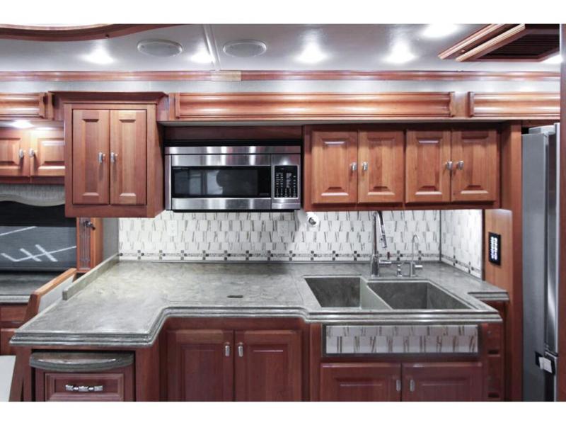 On the inside enjoy dual opposing slide outs in the main kitchen and living space, as well as in the master bedroom and bath area. Just behind the driver and passenger chair you find a dinette with computer work station on the left, plus the kitchen area to follow. Here you will enjoy counter space, a stove-top and range with overhead microwave oven, plus an optional drawer type dishwasher for added convenience. There is also a double sink, a residential refrigerator, pantry, plus ample overhead storage for dishes.