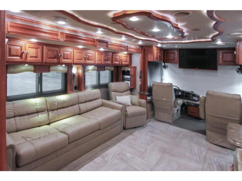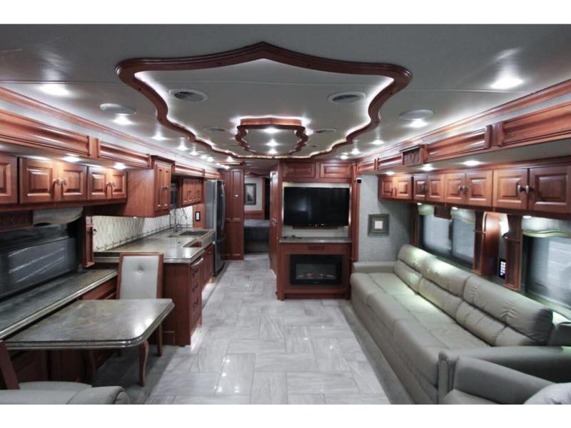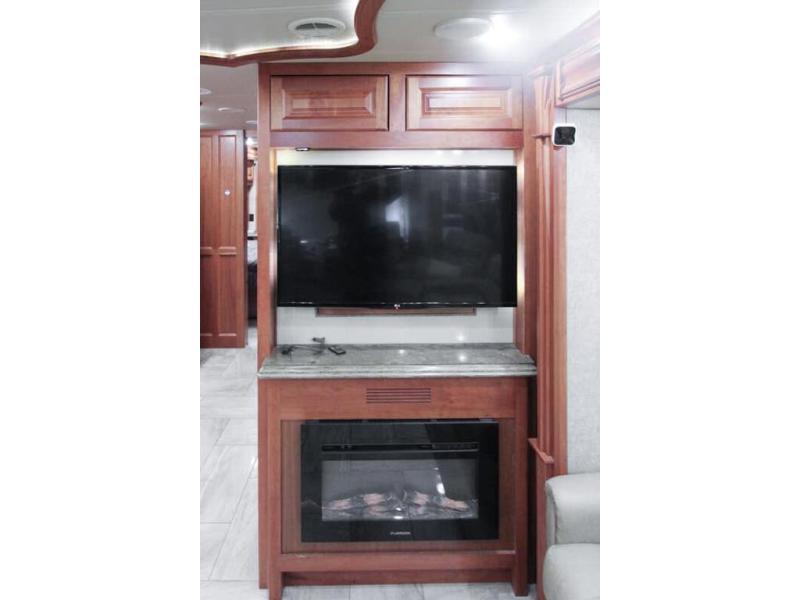 Along the road side there is a slide out sofa bed with ottoman, plus a recliner behind the driver's seat. There is also overhead storage to help keep things neat and organized. A TV and fireplace can be found along the interior wall.