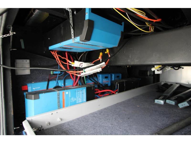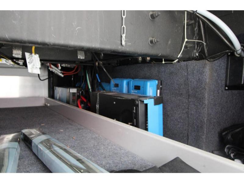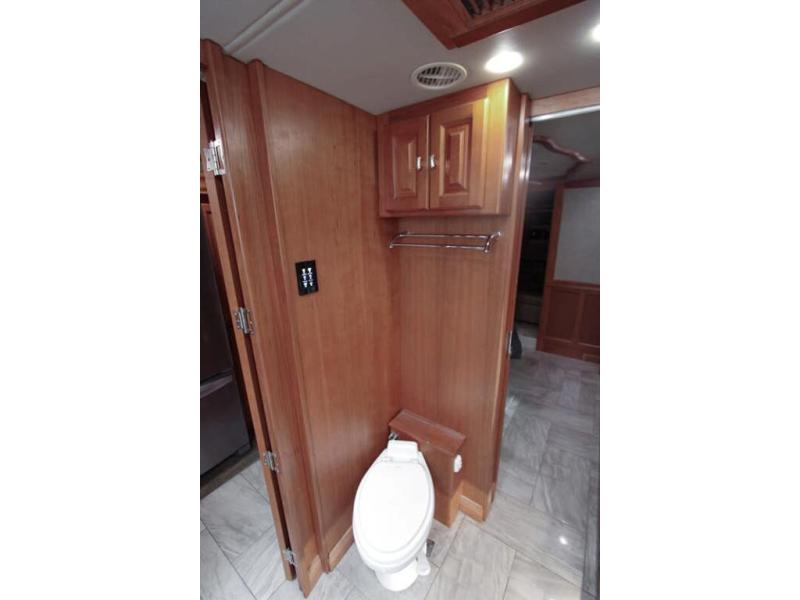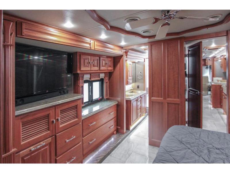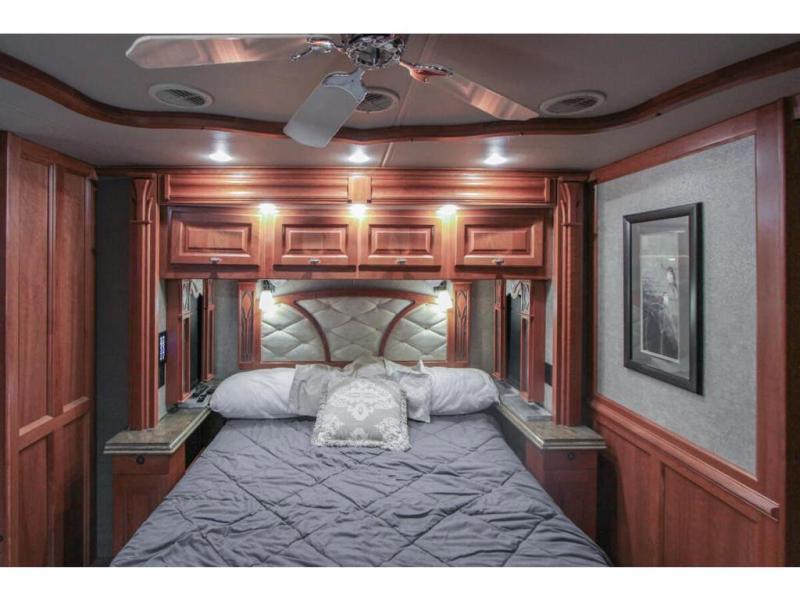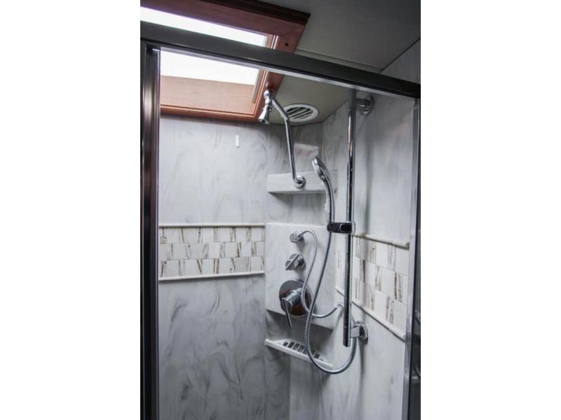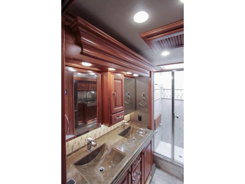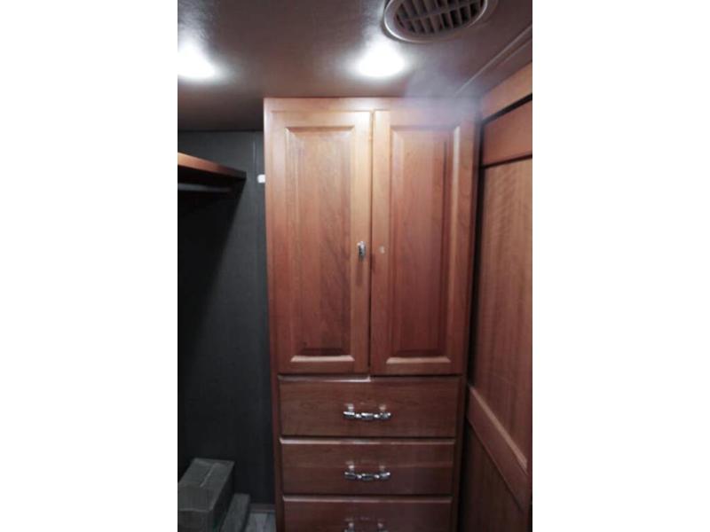 The bathroom is centrally located and offers entry from the living area, or from inside the master bedroom. Enjoy a spacious shower, toilet, and a vanity with dual sinks along with overhead cabinets that are part of the bedroom/bath slide out. This slide continues toward the rear of the unit and features storage with drawers, plus more overhead cabinetry, and a bedroom TV too.