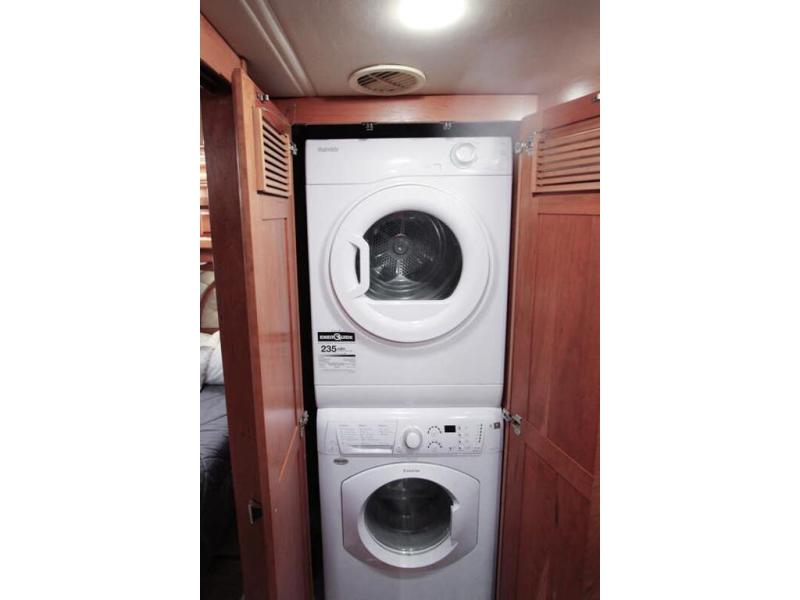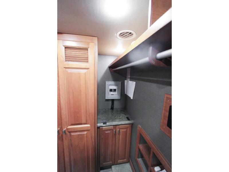 A sliding pocket door is a nice space saver for the bedroom area where you will sleep comfortably on a queen or optional king bed slide out. The slide also features dual nightstands, and more overhead storage. Along the rear wall there is a large walk-in closet with a place for an optional washer and dryer, a hen's nest, and large closet, plus so much more!