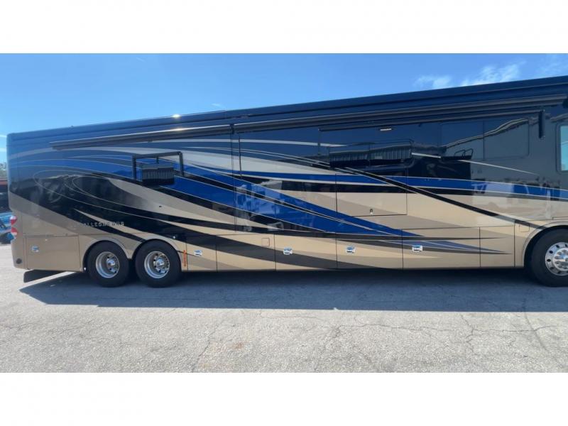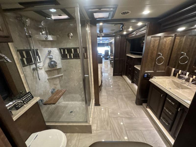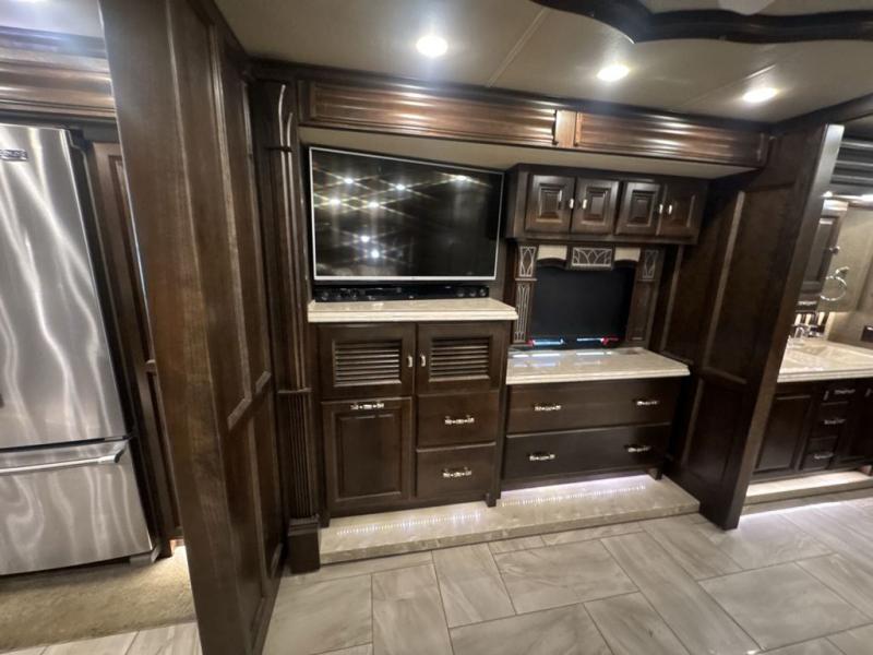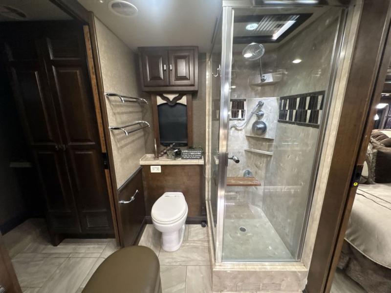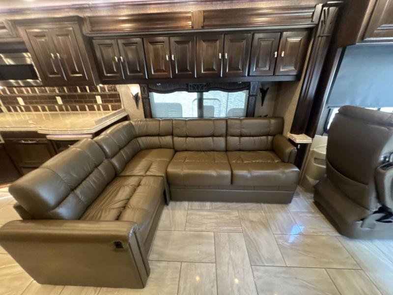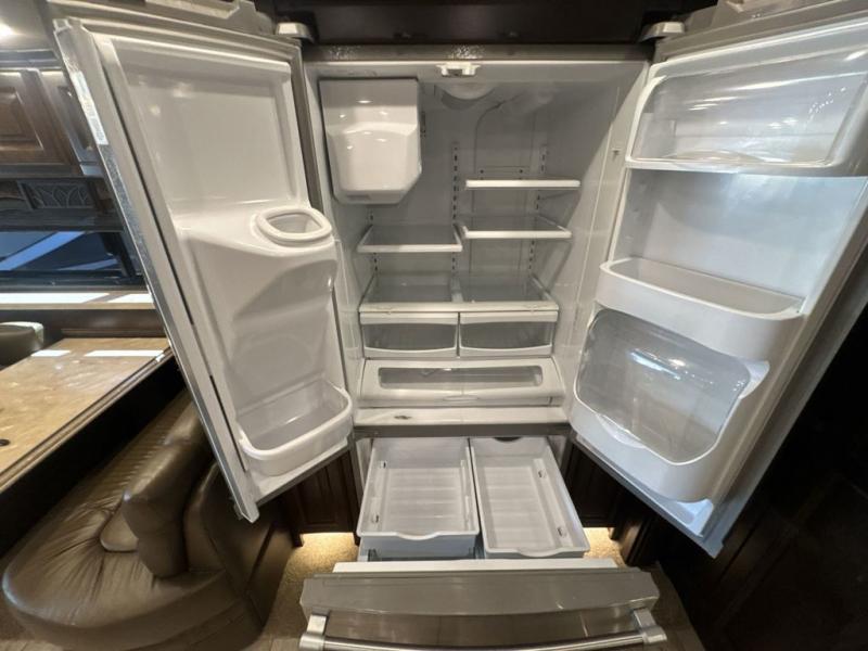 As you enter the motor home, in the front cab there is an overhead TV for your viewing pleasure. The kitchen and living areas are open and spacious with dual opposing slide outs. Along the door side the slide out has a sofa with lift TV, a dinette with computer workstation, two pantries, and a residential refrigerator. The slide out on the opposite side of the motor home features a sofa bed, overhead cabinets, a pull out counter, two burner range, a microwave, and a double kitchen sink. You can even choose to have an optional drawer type dishwasher.