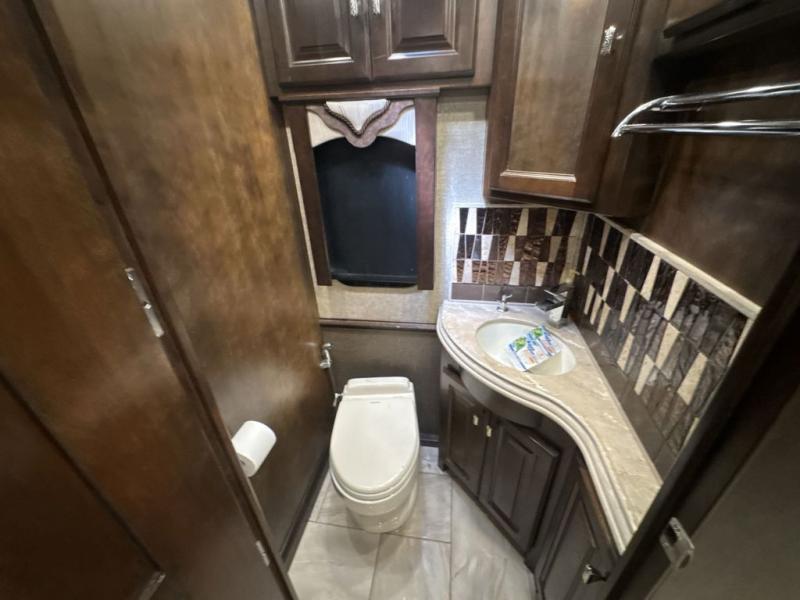 Proceeding toward the rear of the motor home you will find a half bath on the right. Here there is a toilet, sink, and an overhead cabinet.