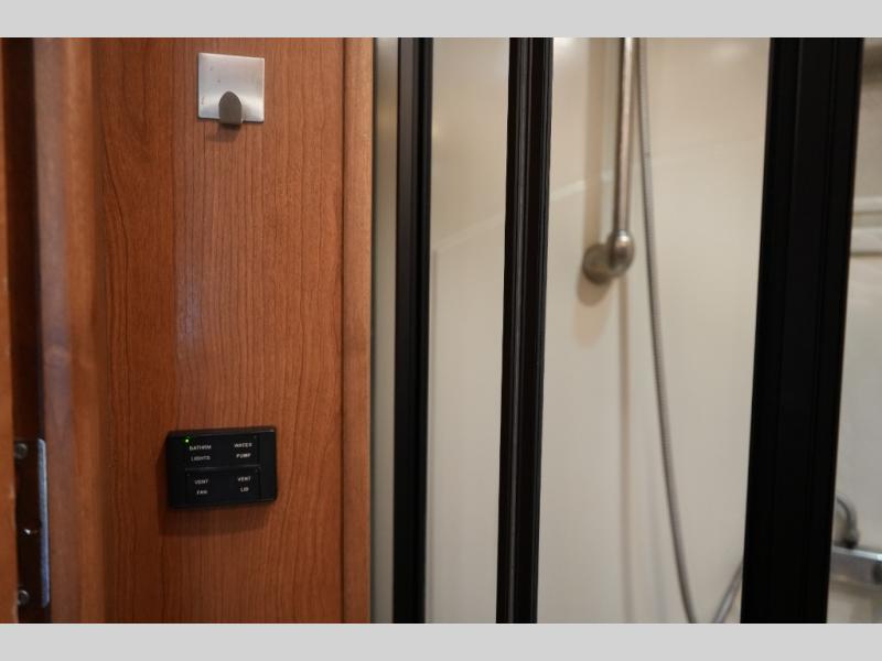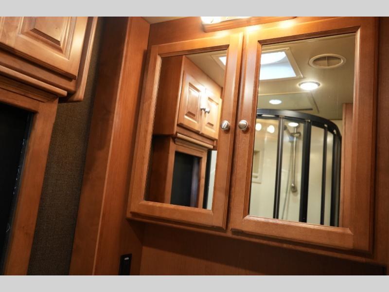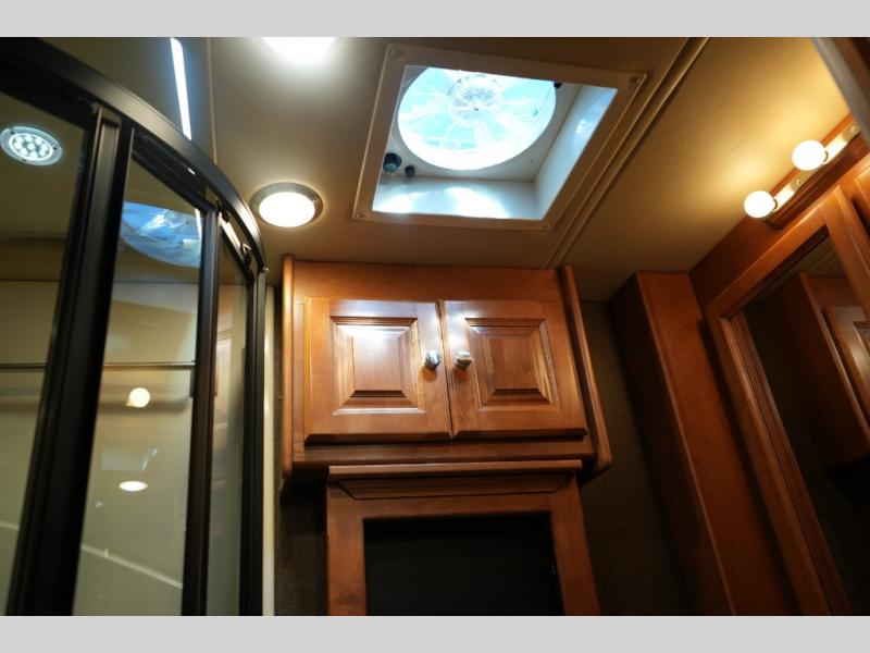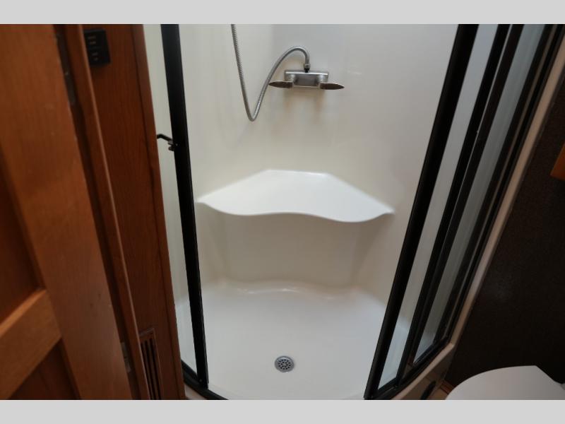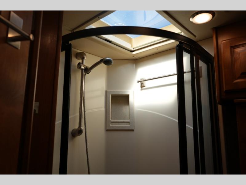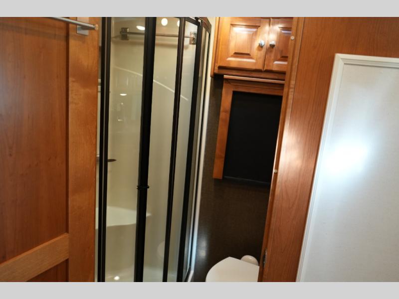 The side-aisle bathroom features a spacious corner shower, vanity, toilet, and linen cabinet.