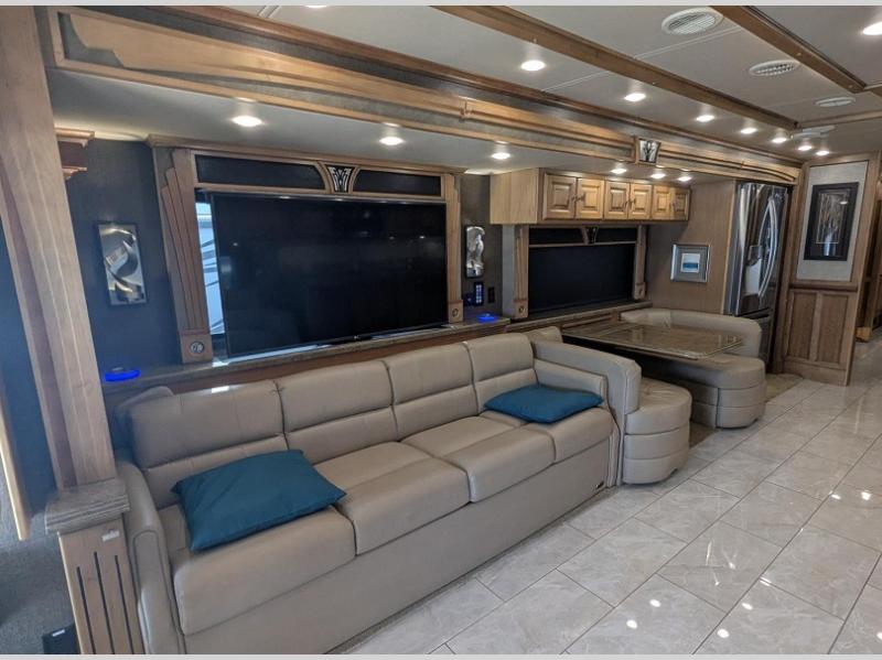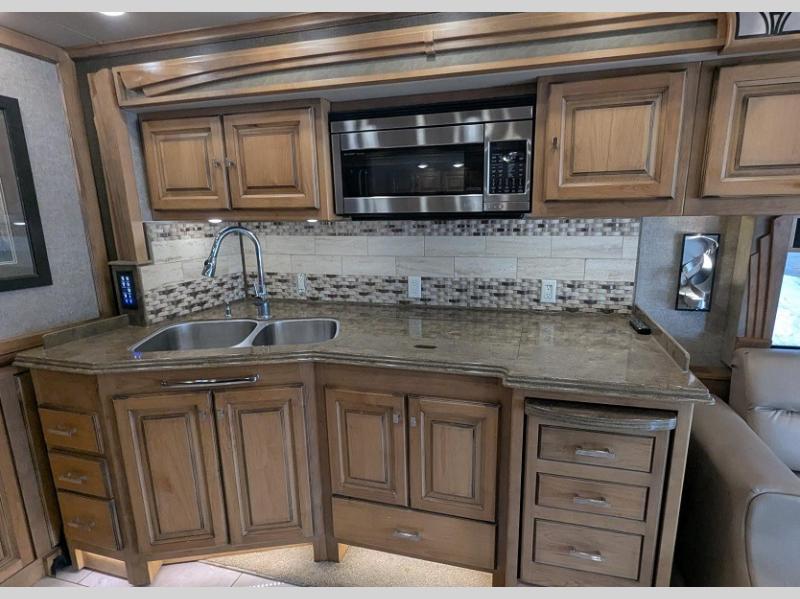 The slide out behind the passenger seat has a TV, sofa bed, booth dinette, and a residential refrigerator. Along the opposite side of the motor home you will find that the slide has a sofa bed, convection microwave, range, optional dishwasher, double kitchen sink, and overhead cabinets.