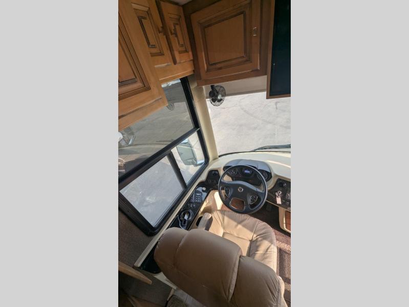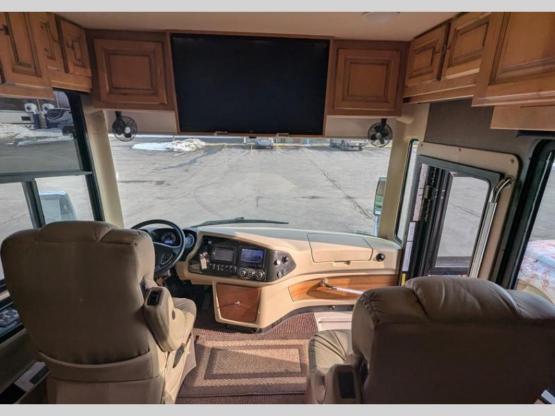 As you enter this motor home, you will find overhead cabinets and a TV in the cab.