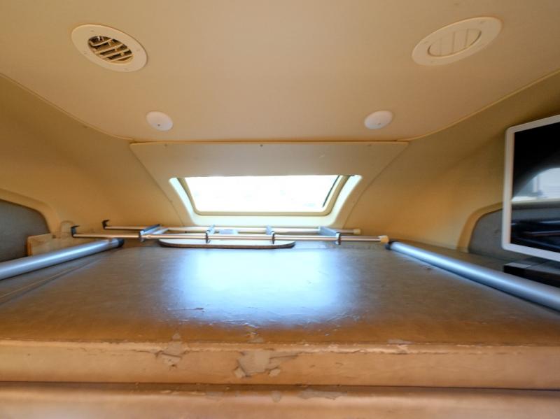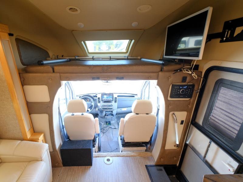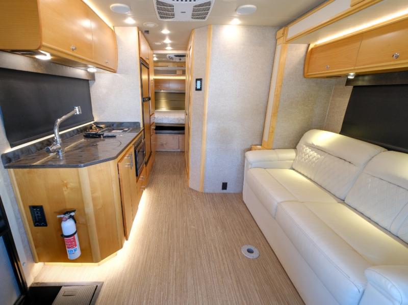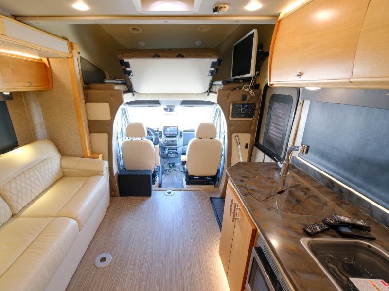 Step inside model 24 QW just behind the front passenger seat. Notice the loft bed over the cab area for additional sleeping space if needed at night.