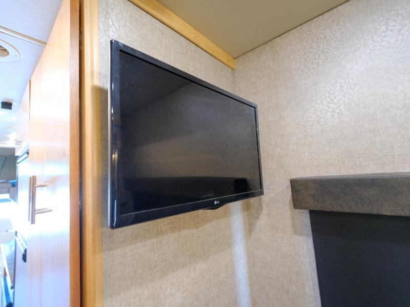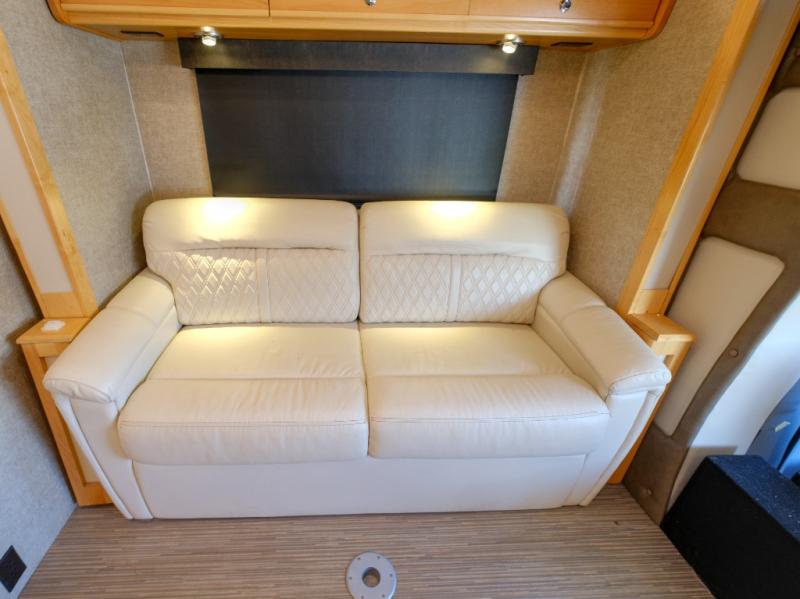 Straight ahead through the entry door you will find a sofa bed slide out along the road side featuring two sets of seat belts and overhead storage for your things. You can easily view the TV located above the entry door from this space, or from the over cab loft too.