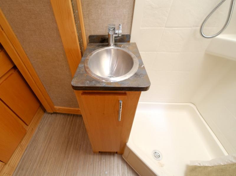 To the left of the entry enjoy your kitchen space which features a round sink for cleaning up, and a two burner cook-top along with storage overhead for your dishes and things. The refrigerator is along side the stove, and has a convection microwave oven located above it. You will easily be able to cook light meals for your family while you travel.