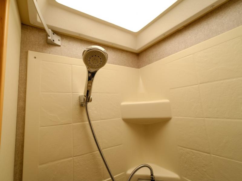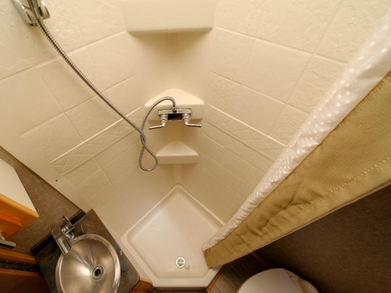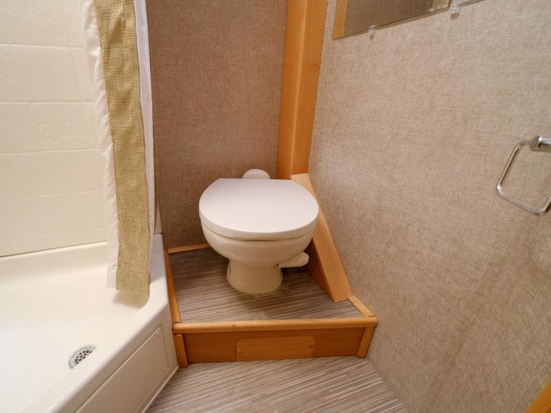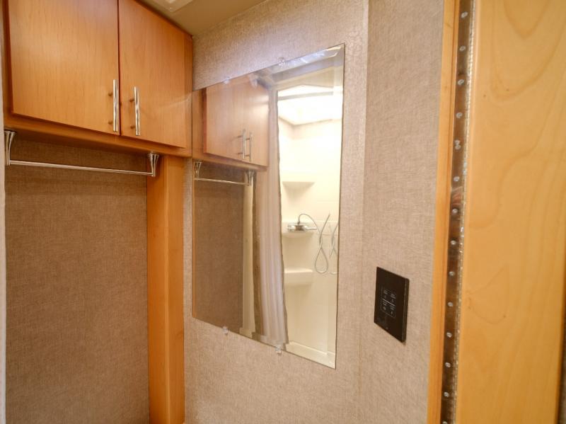 Opposite the refrigerator you will find a full bath including an angled shower, a toilet, and a vanity with sink. There is overhead storage above the sink and toilet, plus a wardrobe opposite along the curb side for your clothing. The door can close off the bathroom area, or it can close off the bed and bath from the rest of the coach.