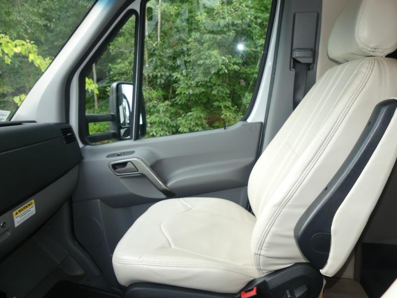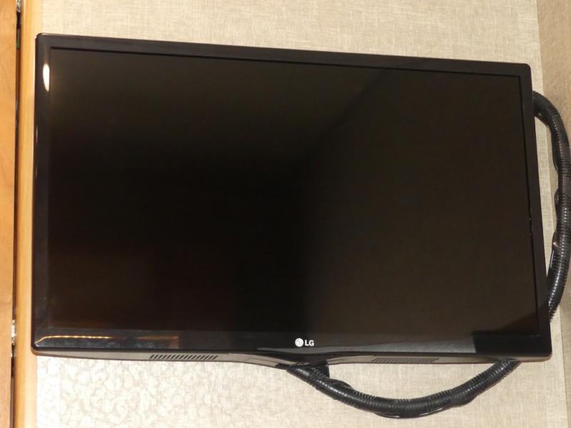 Straight ahead through the entry door you will find a theater seating slide out along the road side and overhead storage for your things. You can easily view the TV located above the entry door from this space.