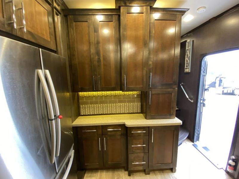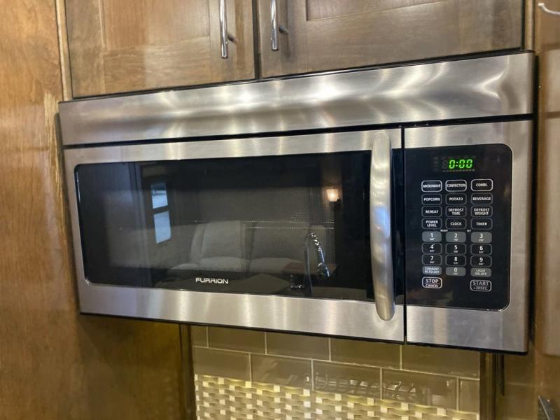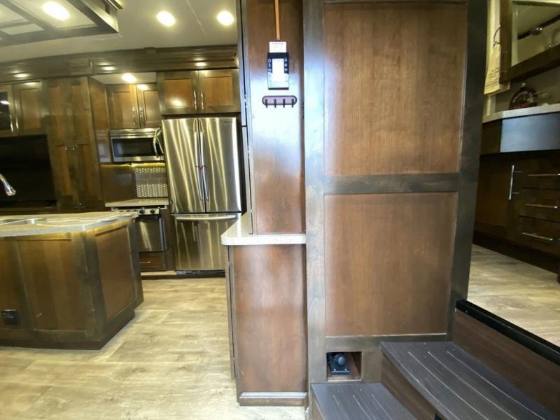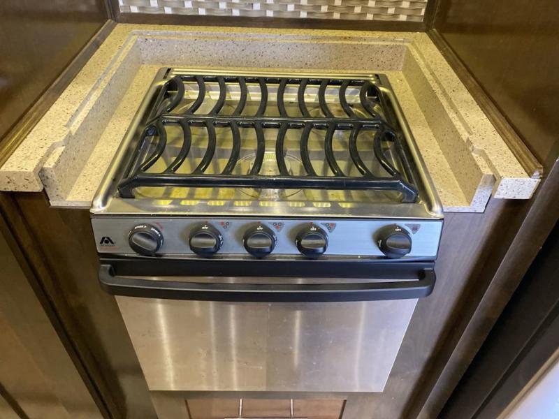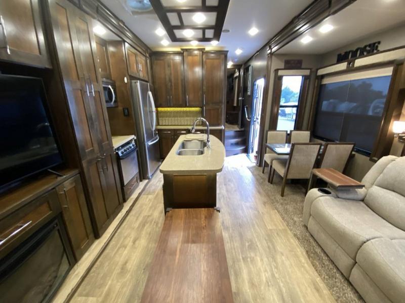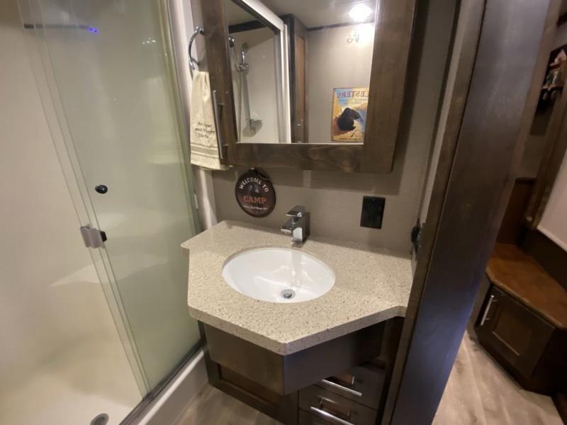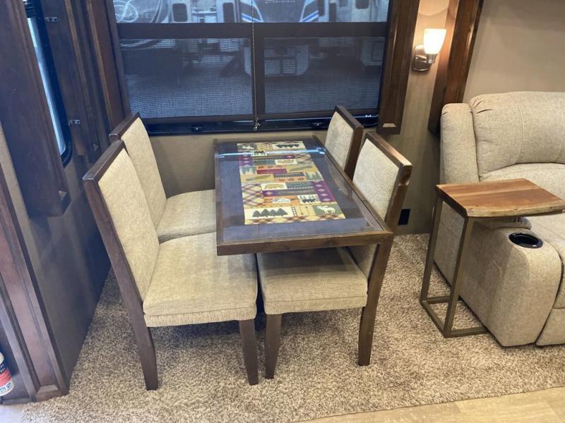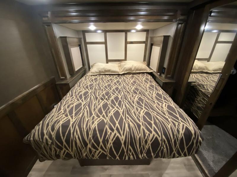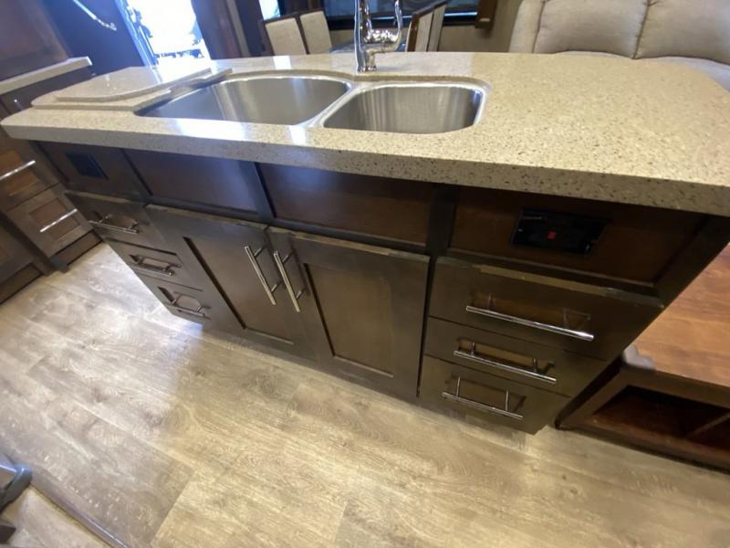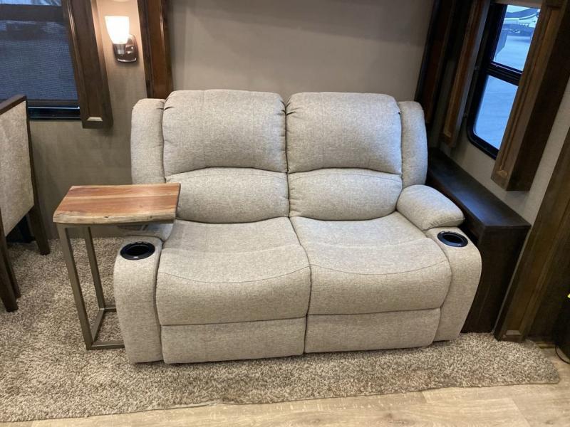 Step inside and notice how open and spacious the main kitchen and living area is with dual opposing slide outs. There is a dining table with four chairs and a theater seating for two in the slide to your immediate left. Along the rear wall you will find more seating with a rear sofa bed including nightstands on either side. Adjacent to the sofa find a 50" LED TV with fireplace within the road side slide out.
