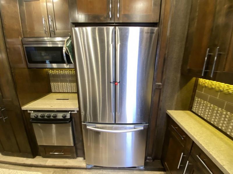 The kitchen is also featured within the road side slide and will have you feeling like you haven't left home. Here there is a slide out residential refrigerator for your perishables, a three burner range, and large double door pantry providing tons of storage. You will find more storage throughout with all of the overhead cabinets plus lower cupboards for dishes and pots and pans. An island counter in the center offers added prep space and more, plus it is the location of the double kitchen sink. Off to the side along the interior wall is added cabinetry both above and below a counter-top so everything can be neatly tucked away when not in use.