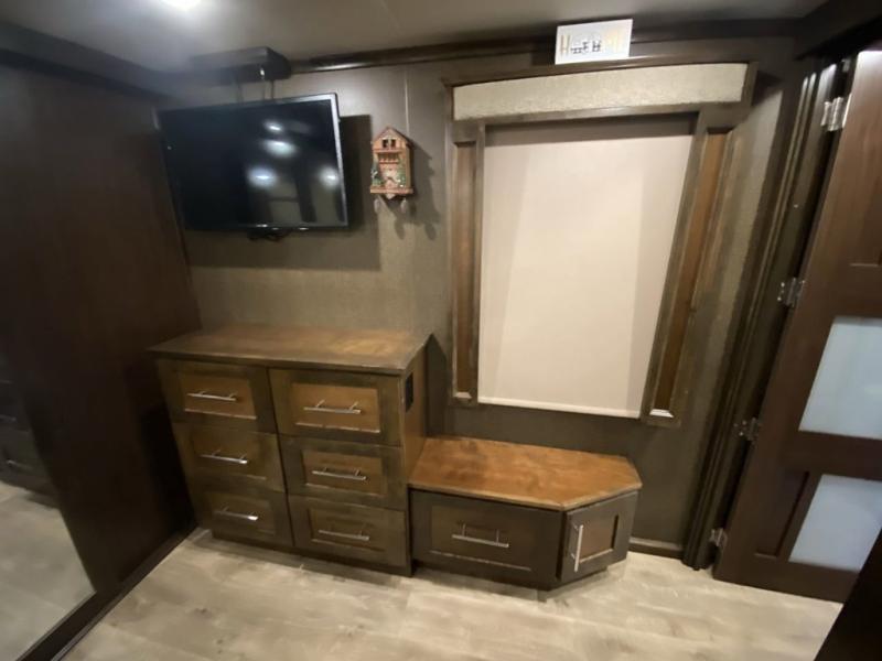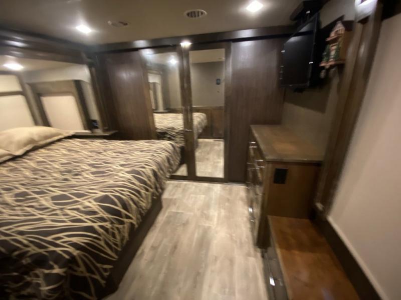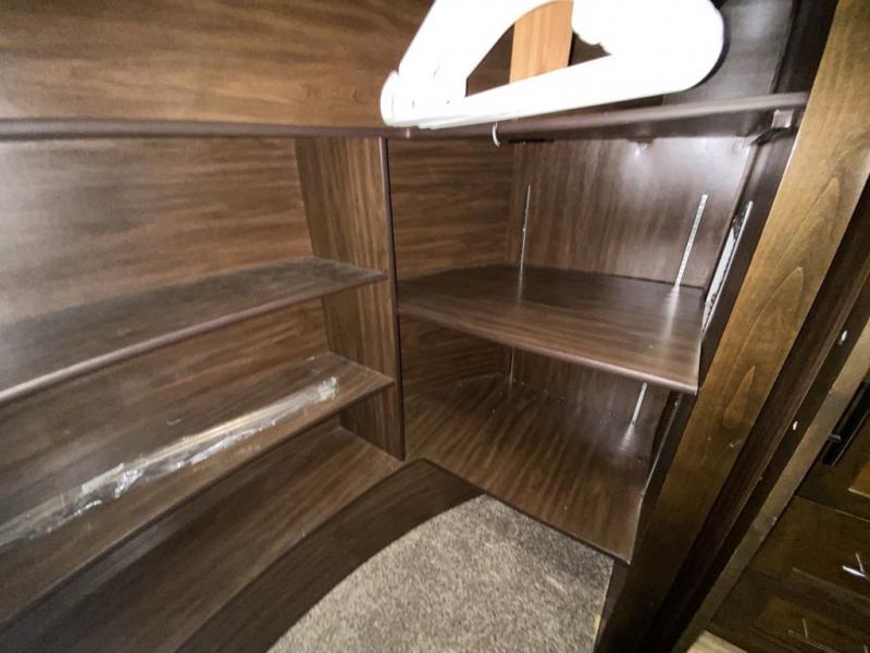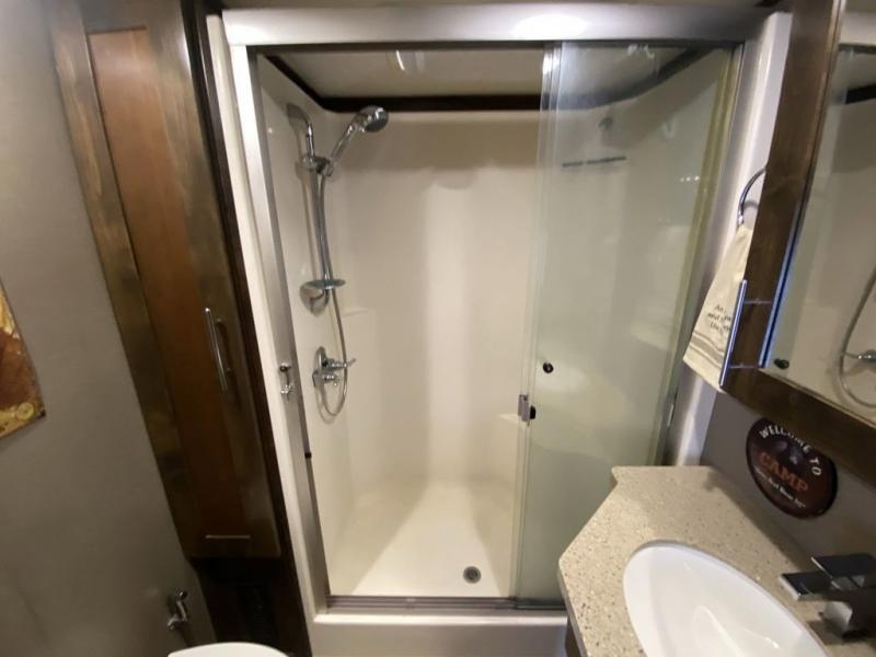 At the head of the hall you can enter a spacious private vacation retreat. Here you can relax and rest up for another fun filled day. Sleep comfortably on the queen size slide out bed including nightstands along both sides. There is a full wall wardrobe along the front wall with sliding doors for your clothing storage needs. Along the curb side wall, opposite the bed, enjoy a 40" chest of drawers with a 32" monitor above, plus so much more!