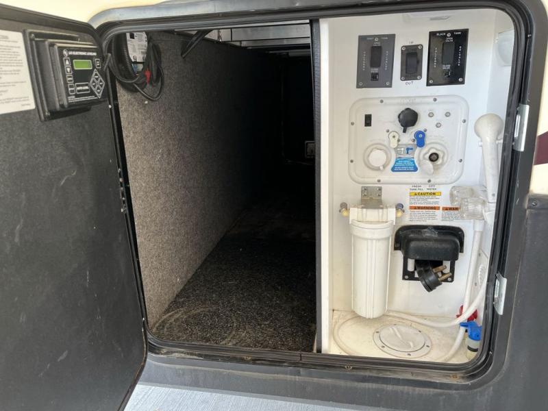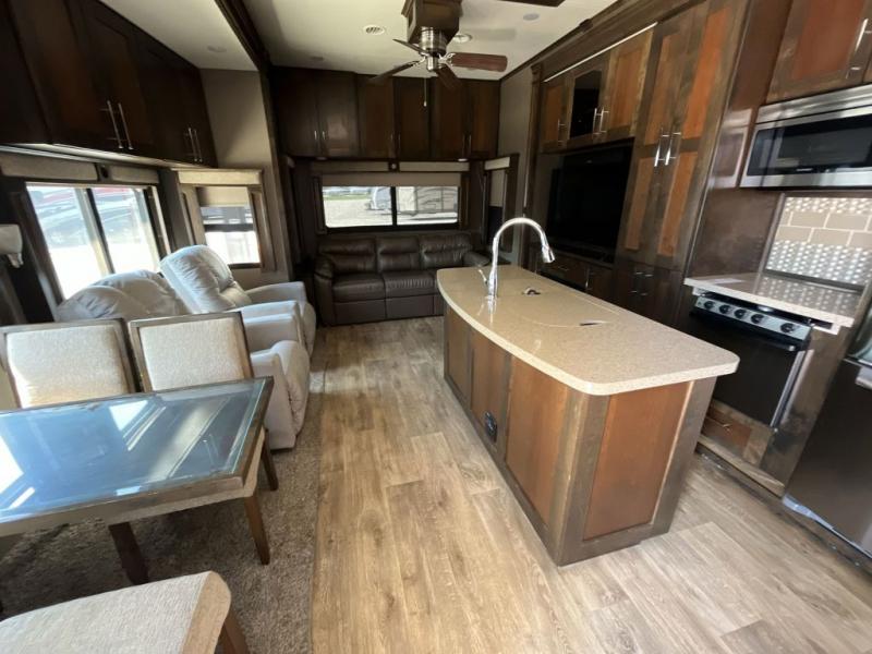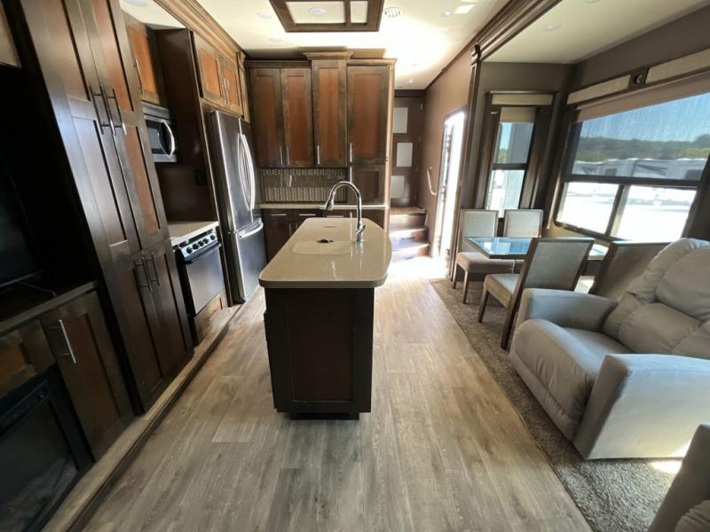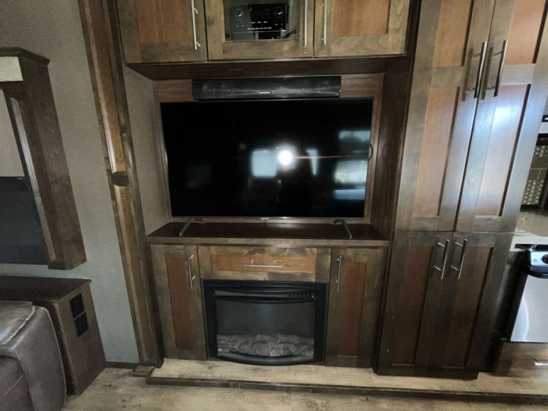 Step inside and notice how open and spacious the main kitchen and living area is with dual opposing slide outs. There is a dining table with four chairs and a theater seating for two in the slide to your immediate left. Along the rear wall you will find more seating with a rear sofa bed including nightstands on either side. Adjacent to the sofa find a 50" LED TV with fireplace within the road side slide out.