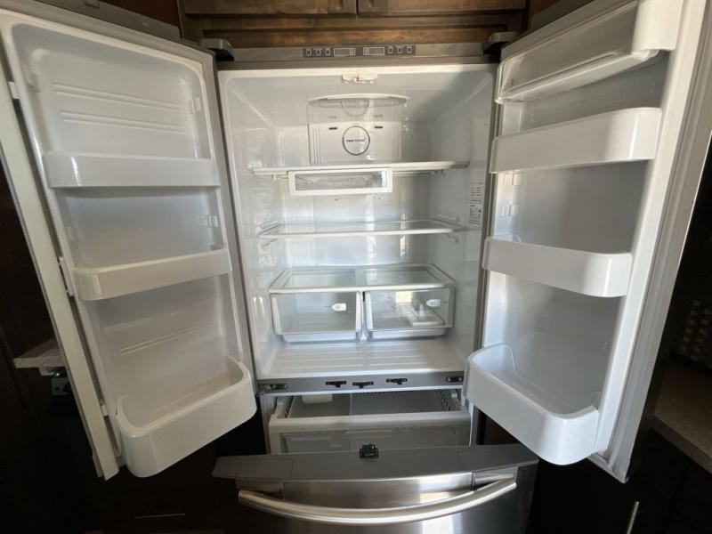 The kitchen is also featured within the road side slide and will have you feeling like you haven't left home. Here there is a slide out residential refrigerator for your perishables, a three burner range, and large double door pantry providing tons of storage. You will find more storage throughout with all of the overhead cabinets plus lower cupboards for dishes and pots and pans. An island counter in the center offers added prep space and more, plus it is the location of the double kitchen sink. Off to the side along the interior wall is added cabinetry both above and below a counter-top so everything can be neatly tucked away when not in use.