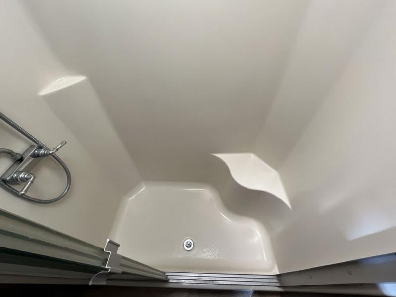 At the head of the hall you can enter a spacious private vacation retreat. Here you can relax and rest up for another fun filled day. Sleep comfortably on the queen size slide out bed including nightstands along both sides. There is a full wall wardrobe along the front wall with sliding doors for your clothing storage needs. Along the curb side wall, opposite the bed, enjoy a 40" chest of drawers with a 32" monitor above, plus so much more!