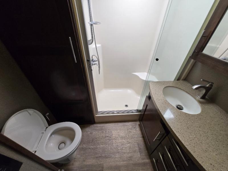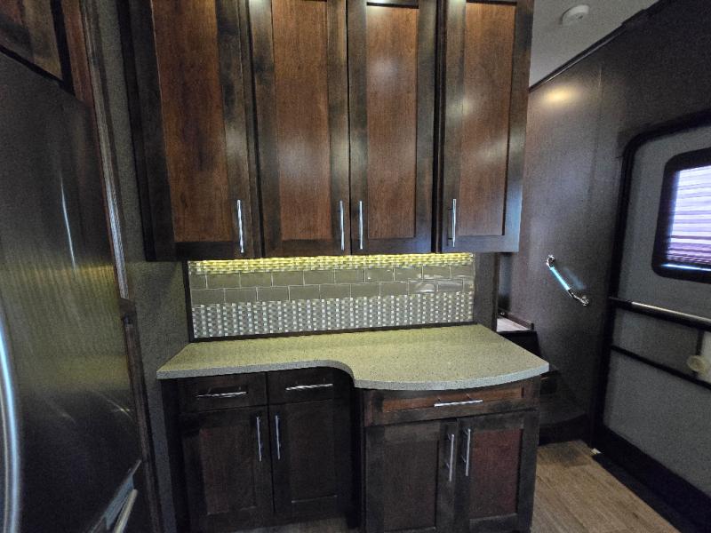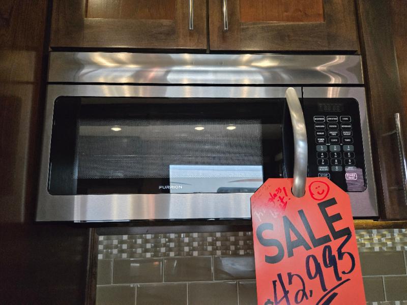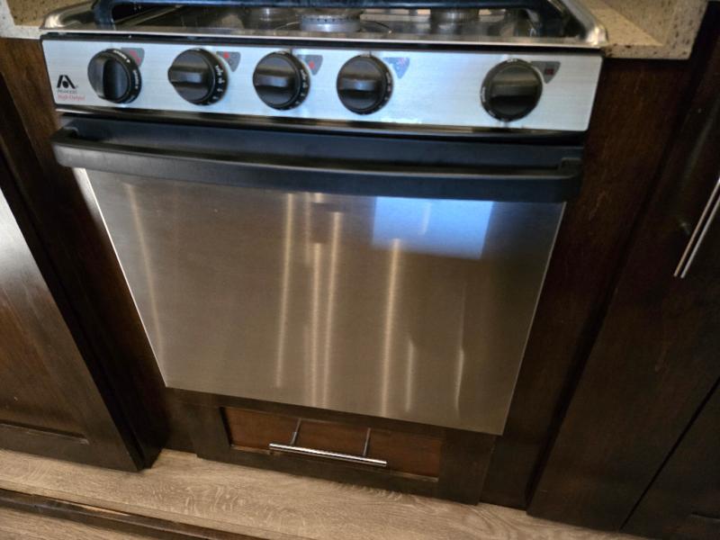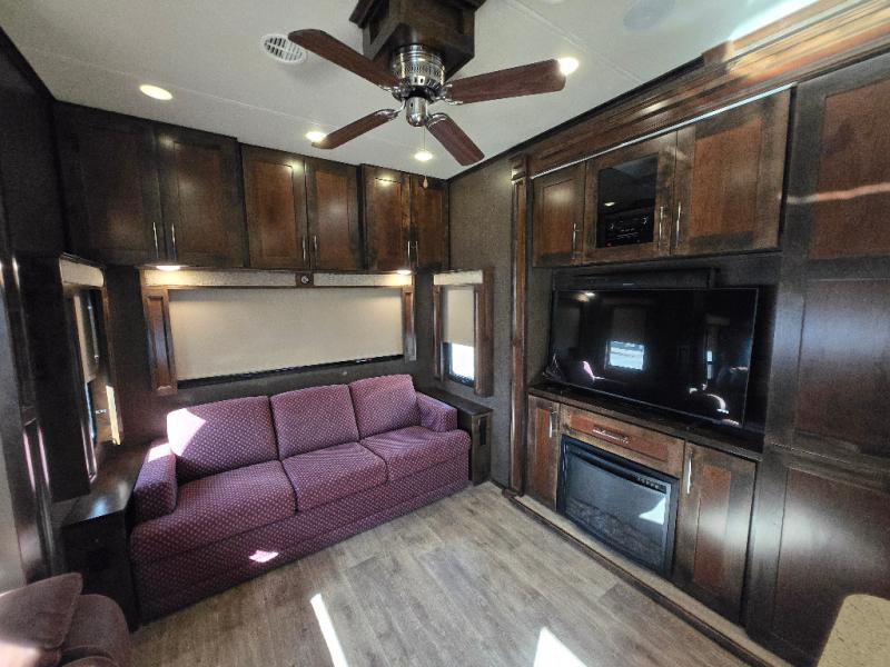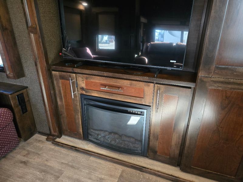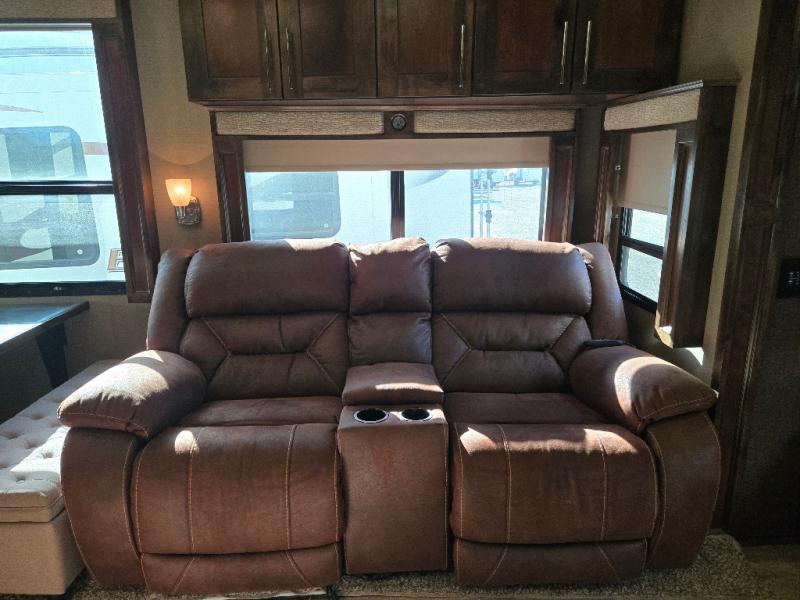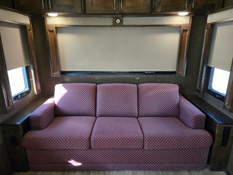 Start with four sturdy aluminum entry steps to the inside. Notice the wide open living area to your left thanks to dual opposing slide outs. There is a free standing dinette with four chairs and a theater seat with cup holders in the slide immediately to your left. Along the rear wall enjoy more seating at an 80" sofa bed. From here you can easily enjoy the 50" LED TV and fireplace in the adjacent slide out that also contains the kitchen appliances and a retractable desk.