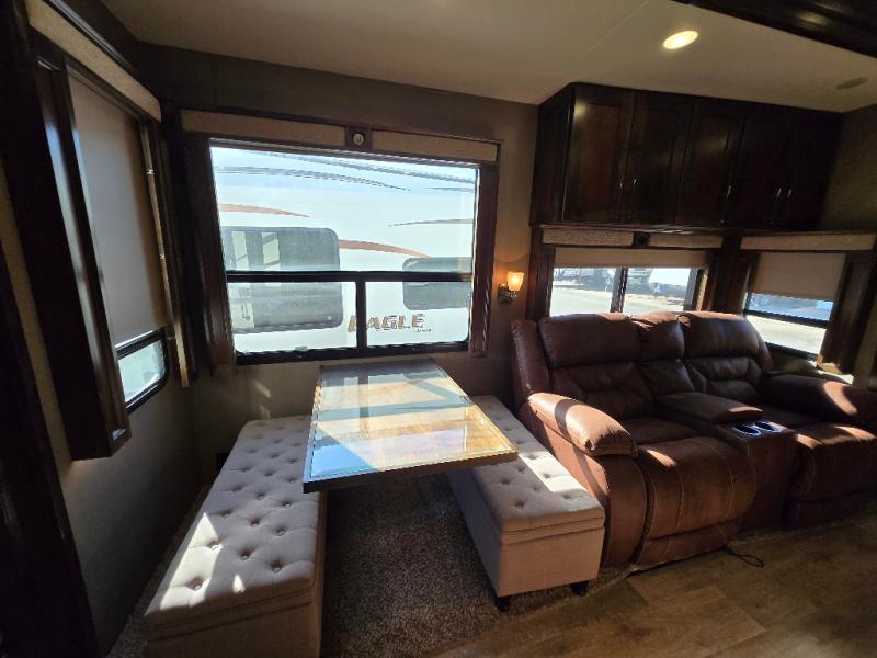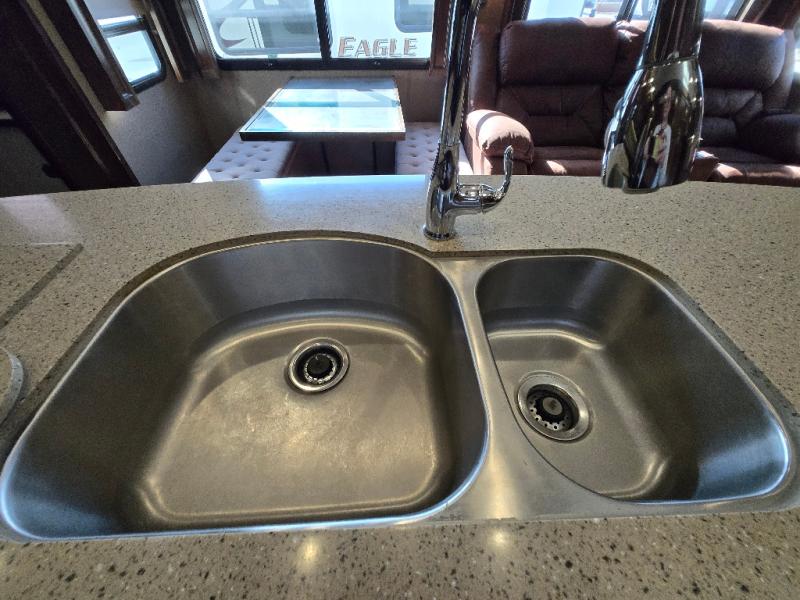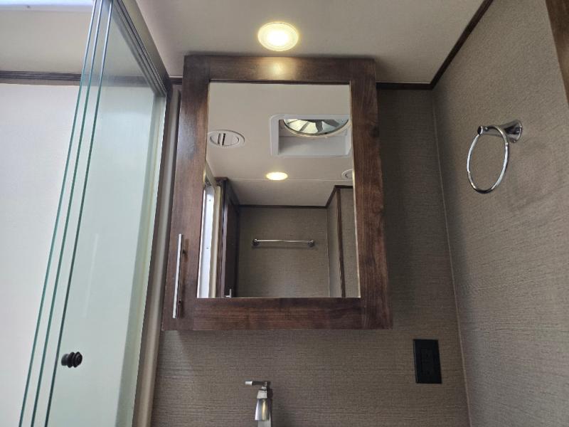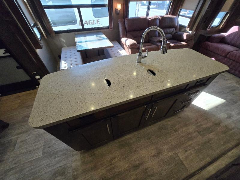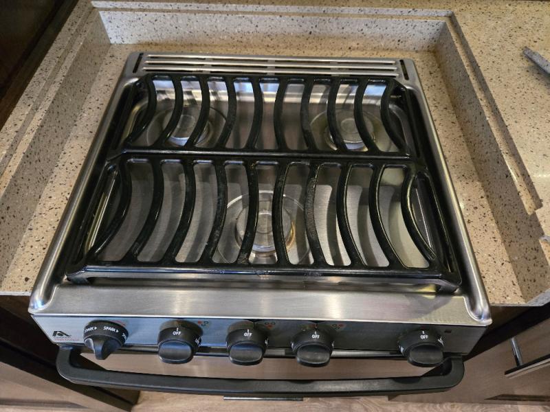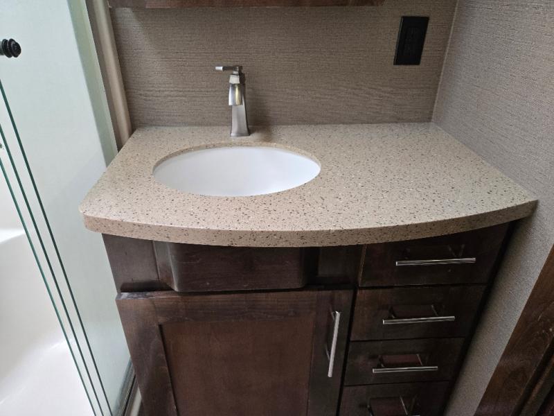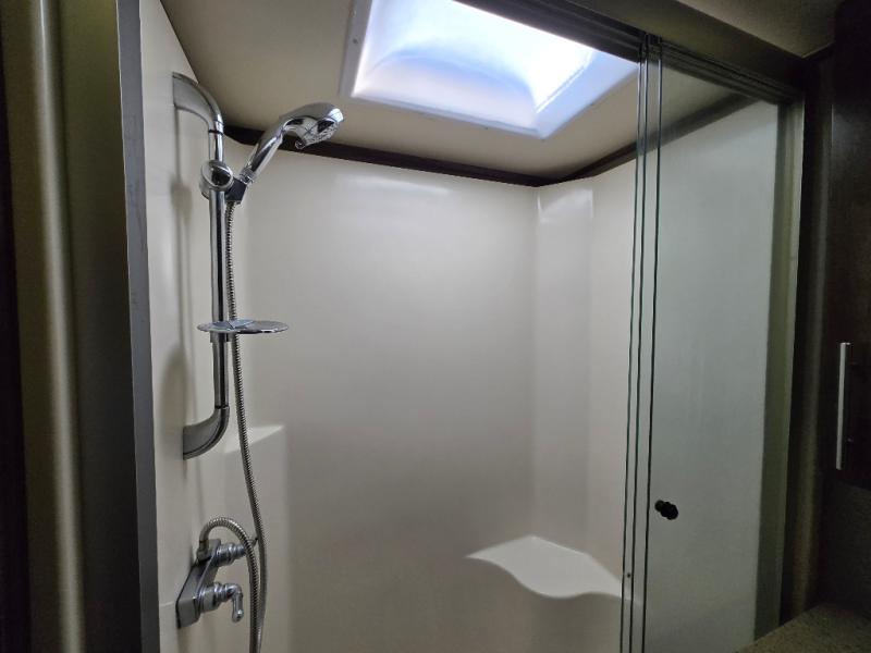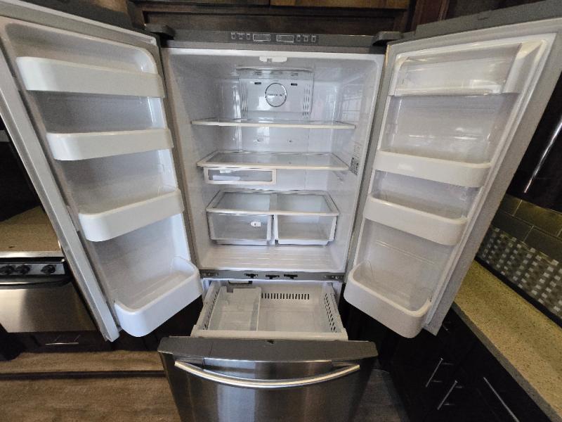 Start with four sturdy aluminum entry steps to the inside. Notice the wide open living area to your left thanks to dual opposing slide outs. There is a free standing dinette with four chairs and a theater seat with cup holders in the slide immediately to your left. Along the rear wall enjoy more seating at an 80" sofa bed. From here you can easily enjoy the 50" LED TV and fireplace in the adjacent slide out that also contains the kitchen appliances and a retractable desk.