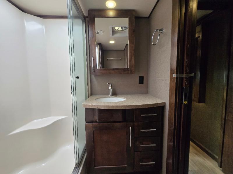 Head up the steps to a front master bedroom and complete bath. The bath is on your left at the top of the steps up and features a toilet, a 48" x 30" shower, and vanity with round vessel sink. There is also a medicine cabinet, plus a nice linen closet for towels and toiletries. The sliding door is a great space saver in both the bathroom and the hall.