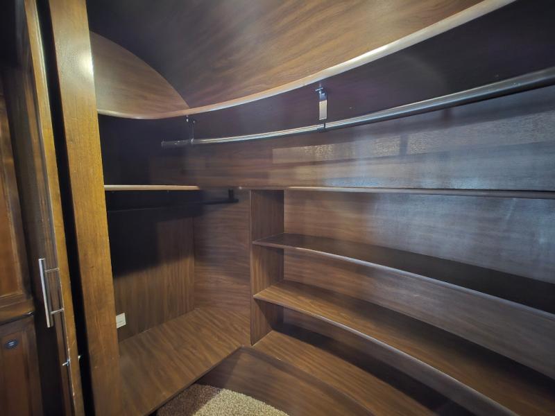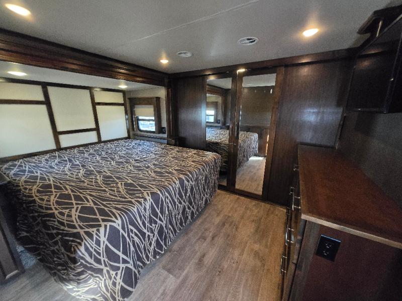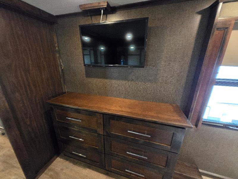 The front master bedroom offers a relaxing retreat with a slide out king size bed. There are nightstands on either side, and a dresser opposite with a 32" LED TV above. The front features a full wall wardrobe for all of your hanging clothes, plus so much more!