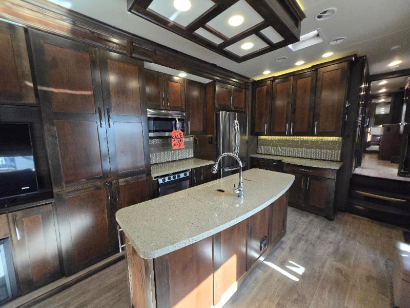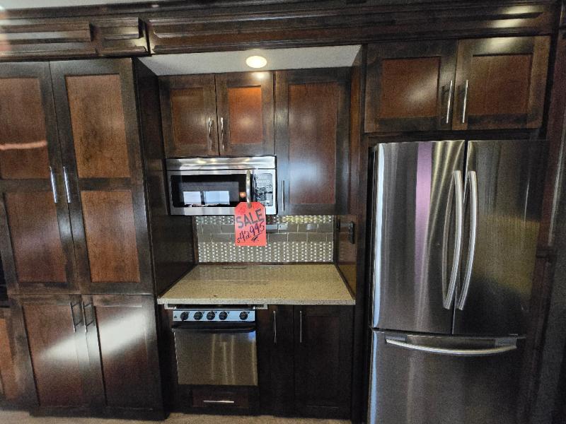 The kitchen is centrally located and features a large island with double sinks, and overhead lighting. There is a residential refrigerator for all of your perishables, more counter space, plus a three burner range and pantry with adjustable shelving. A nice storage hutch can be found off to the side that is located along the interior living room wall straight in from the entry door.