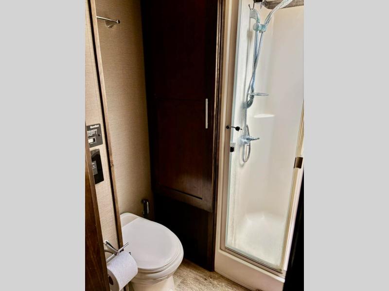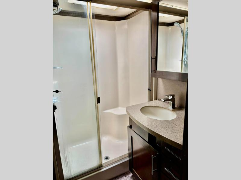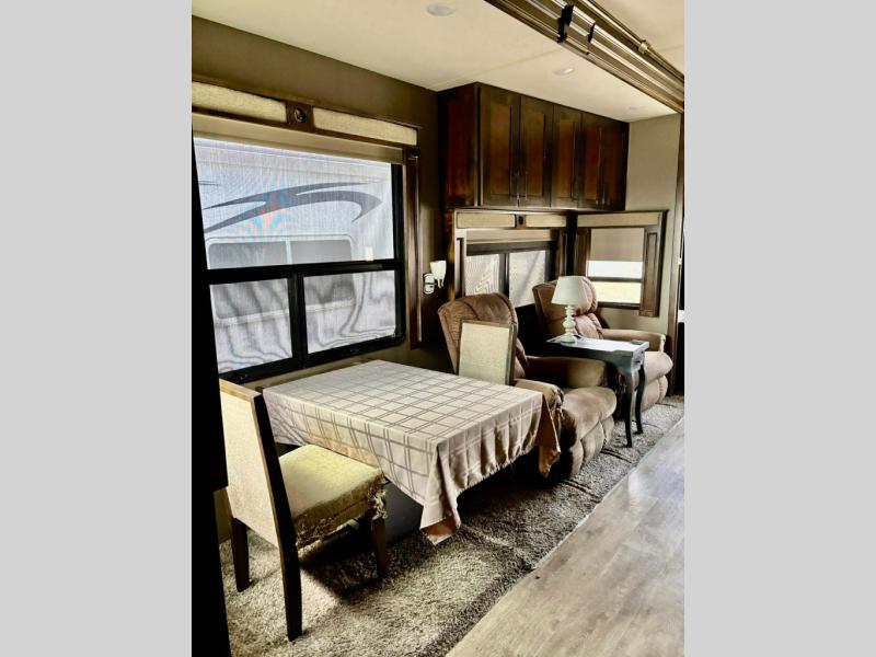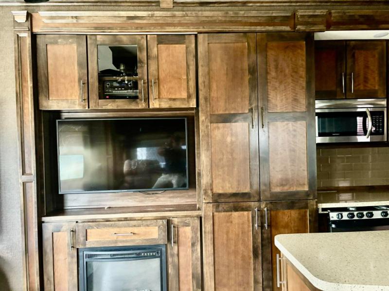 Start with four sturdy aluminum entry steps to the inside. Notice the wide open living area to your left thanks to dual opposing slide outs. There is a free standing dinette with four chairs and a theater seat with cup holders in the slide immediately to your left. Along the rear wall enjoy more seating at an 80" sofa bed. From here you can easily enjoy the 50" LED TV and fireplace in the adjacent slide out that also contains the kitchen appliances and a retractable desk.