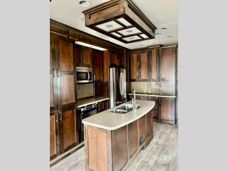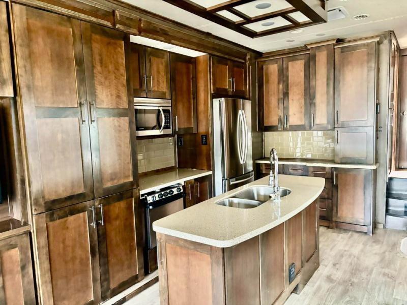 The kitchen is centrally located and features a large island with double sinks, and overhead lighting. There is a residential refrigerator for all of your perishables, more counter space, plus a three burner range and pantry with adjustable shelving. A nice storage hutch can be found off to the side that is located along the interior living room wall straight in from the entry door.