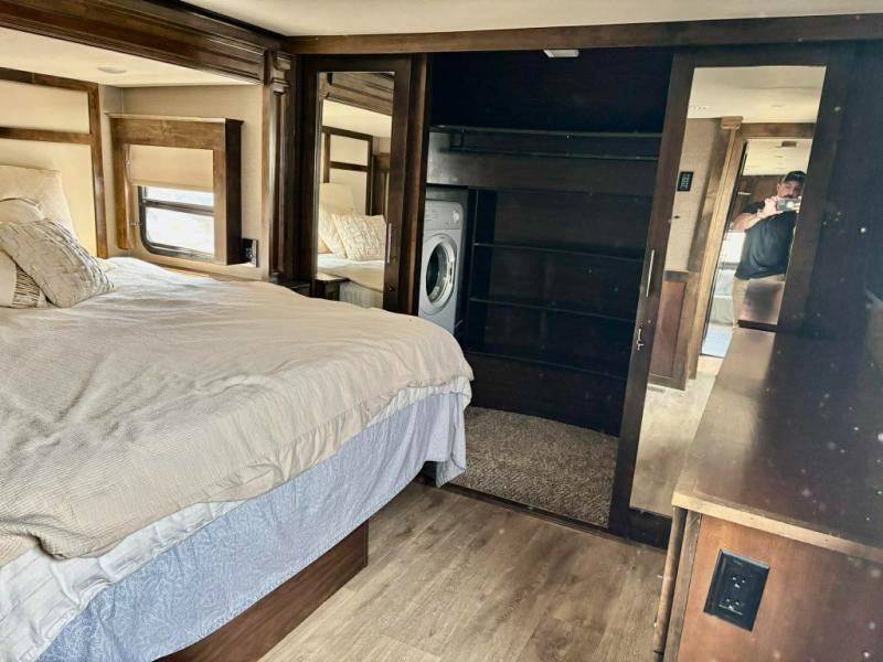 The front master bedroom offers a relaxing retreat with a slide out king size bed. There are nightstands on either side, and a dresser opposite with a 32" LED TV above. The front features a full wall wardrobe for all of your hanging clothes, plus so much more!