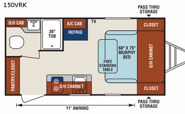 In the very front enjoy your meals at the free standing dinette during daytime hours, and at night you can sleep comfortably on the Murphy Bed that folds down out of the cabinet across the front. There are also closets on either side of the bed for your clothing storage, and so much more!