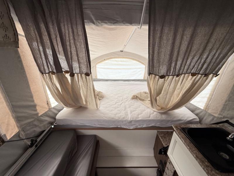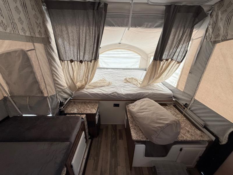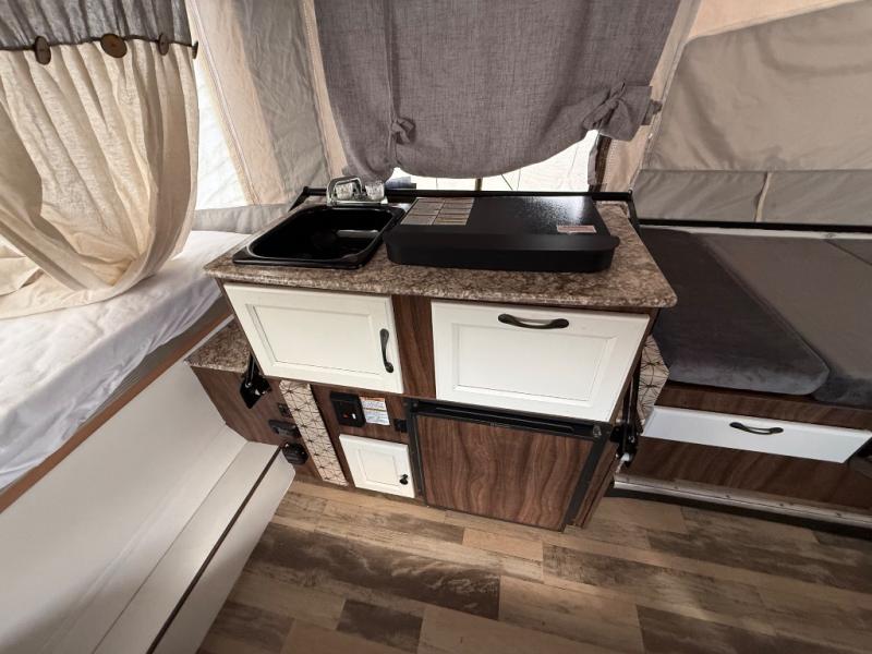 On the inside of this pop-up camper you will enjoy plenty of space with a slide out dinette and table that can be used inside or outdoors. There is lounge seating as well as plenty of storage in the provided cabinets, plus more storage under the dinette bench seats.