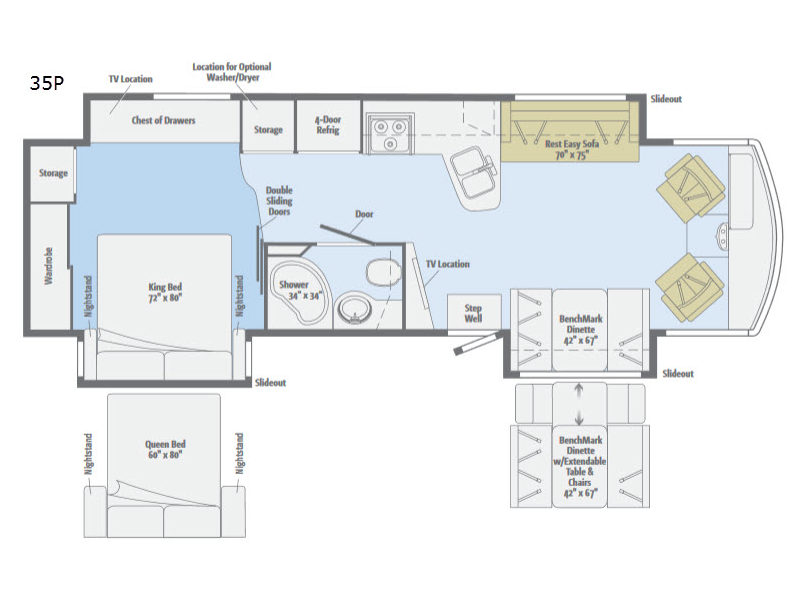 As you enter notice the BenchMark dinette slide out on the right side, or you can choose a dinette with an extendable table and chairs. There is an entertainment center with a 48" HDTV located to the left of the door at an angle for perfect viewing from any seating in the space.