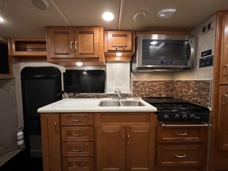 The kitchen area is to the left of the main entry door and features a counter area for food prep, a double sink, a three burner range, and a pantry for dry and canned good storage. There is also a nice refrigerator/freezer for everything you need to keep nice and cold. Choose the optional 4-door refrigerator/freezer for a bit more storage space. This will remove the pantry next door due to the increased size. You will also find ample storage in the overhead cabinets for dishes and things. There is a 28" HDTV above the counter area that can easily be viewed from the seating opposite.