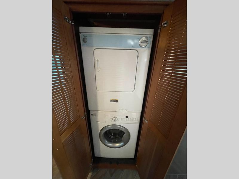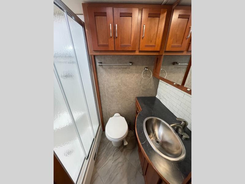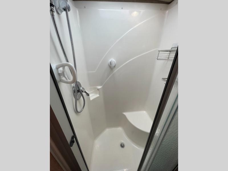 The complete bath is also centrally located and provides a shower, toilet, and vanity with sink, plus overhead storage.