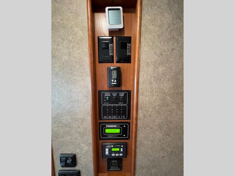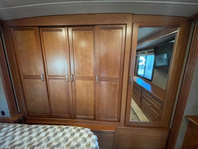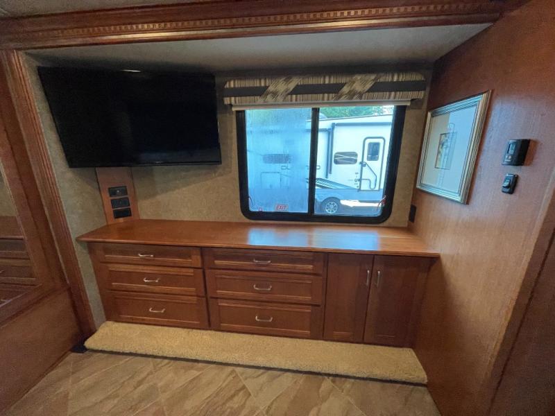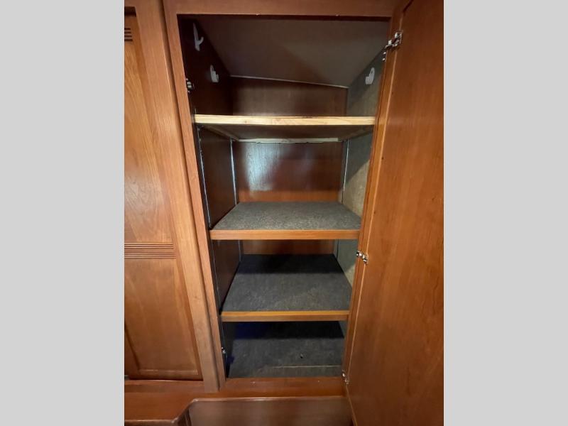 The rear master bedroom features a queen bed slide including nightstands and overhead storage. The chest of drawers opposite is part of the large slide on the road side that also features the kitchen appliances. Here you will enjoy storage drawers for your things, plus there is a 40" HDTV as well. Along the rear wall find even more storage with a wardrobe and more cabinetry. You can also choose a king size bed if you wish for a bit more sleeping space, plus so much more.