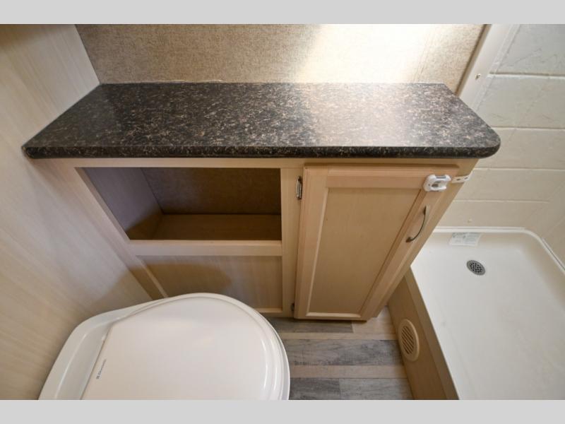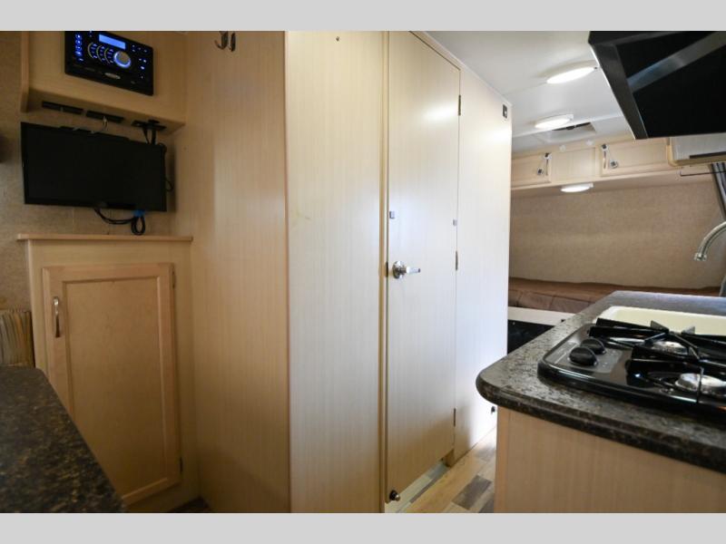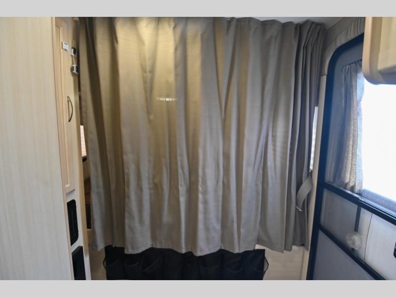 As you enter model 1705RD you will see a queen size bed along the front wall the runs sideways the width of the trailer. A wardrobe for your clothing is beside the bed along the road side wall.