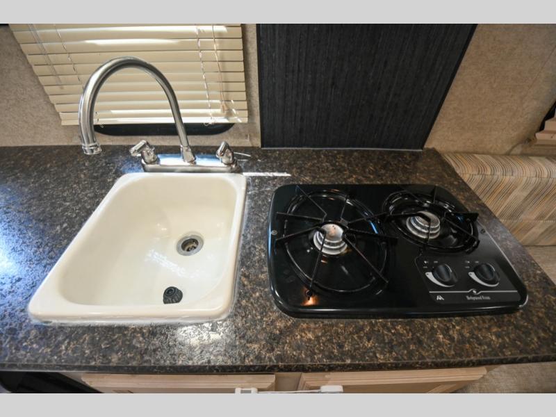 Next to the entry door, the kitchen includes a bit of counter space with overhead storage, a single sink, and two burner range.