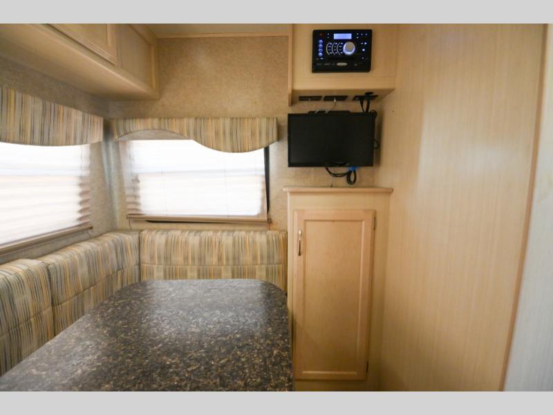 There is a u-shaped dinette in the rear including an entertainment center along the interior wall. This provides a dining and relaxing area as well as extra sleeping space at night when needed, plus more.