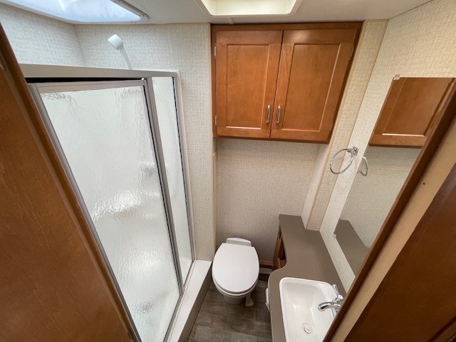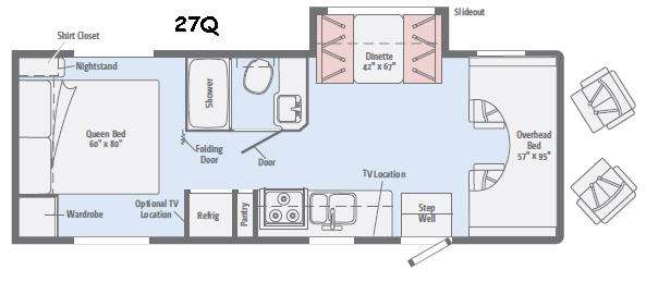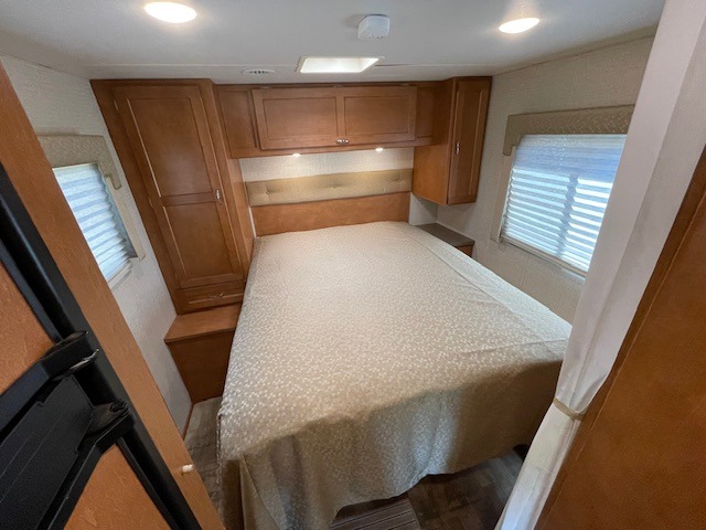 Model 27Q offers a rear bedroom with queen size bed including a nightstand and wardrobe. There is also an overhead cabinet for more storage, and a space for an optional TV if you like. A folding door can be closed to provide more privacy at night or when getting dressed.