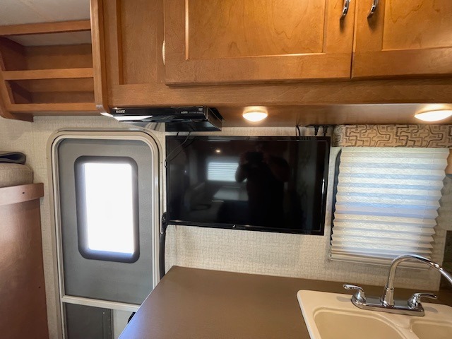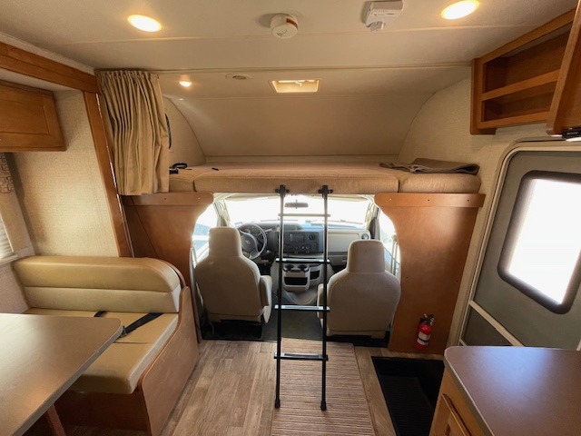Up front there is an overhead bunk above the cab seats that is 57" x 95". The kids will enjoy sleeping up top and there is also a space for an optional 32" HDTV w/DVD player and remote above the counter area near the double kitchen sink, plus so much more!