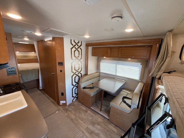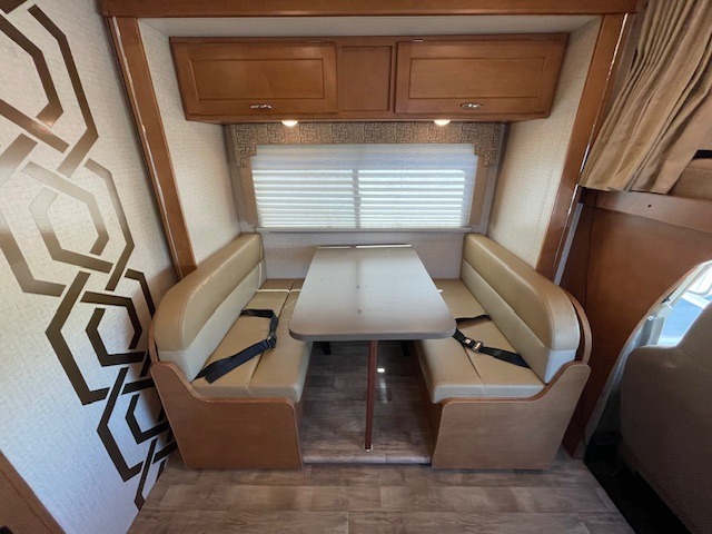 You will easily be able to cook up light meals and snacks while on the go in this Minnie Winnie kitchen featuring a refrigerator, pantry, three burner range, double sink, and counter area. There are also overhead cabinets for dishes and things. Once the meals are created enjoy dining at the slide out booth dinette that also features four sets of seat belts so everyone can remain secure while the motor home is moving. At night the dinette can easily be made into additional sleeping space for family or extra overnight guests.