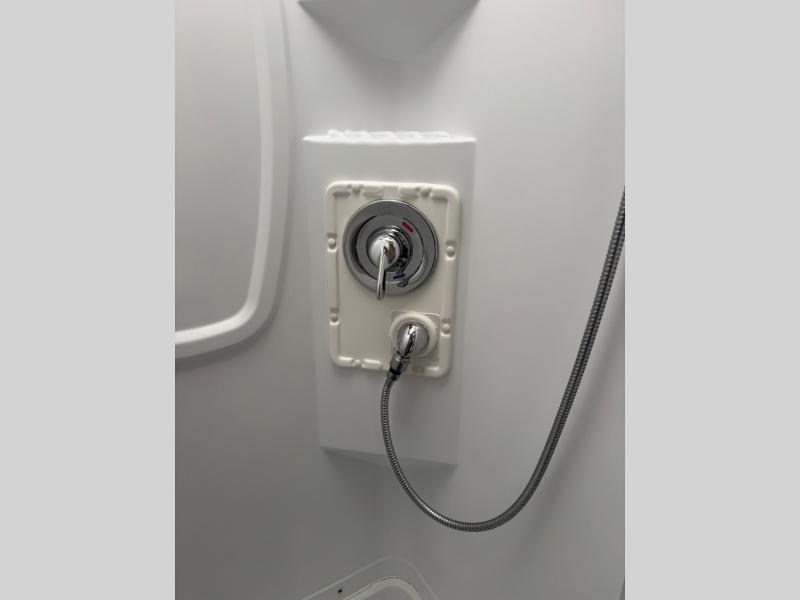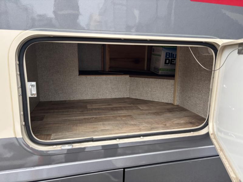 The rear double bed offers storage along the head of the bed, and also the curb side wall. There is a spot to add an optional flat screen 24" HDTV to the bedroom if you choose.
