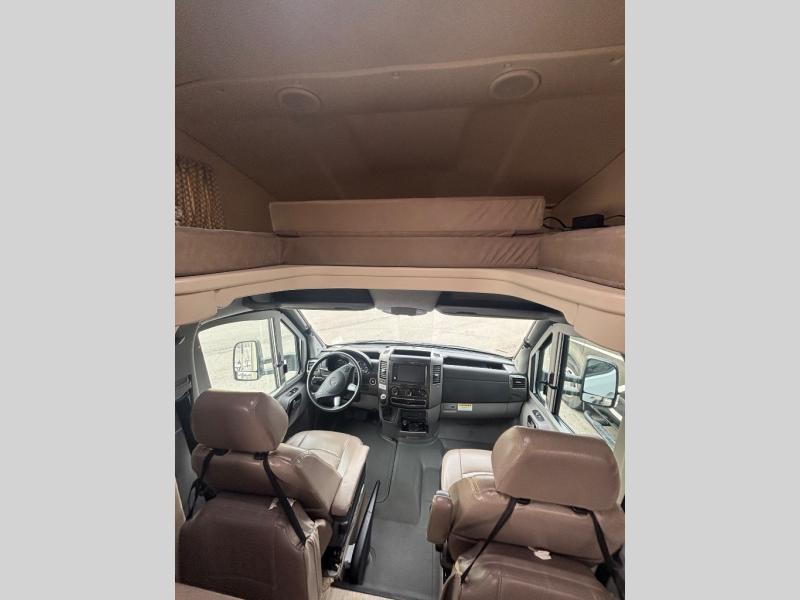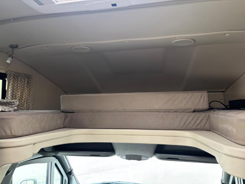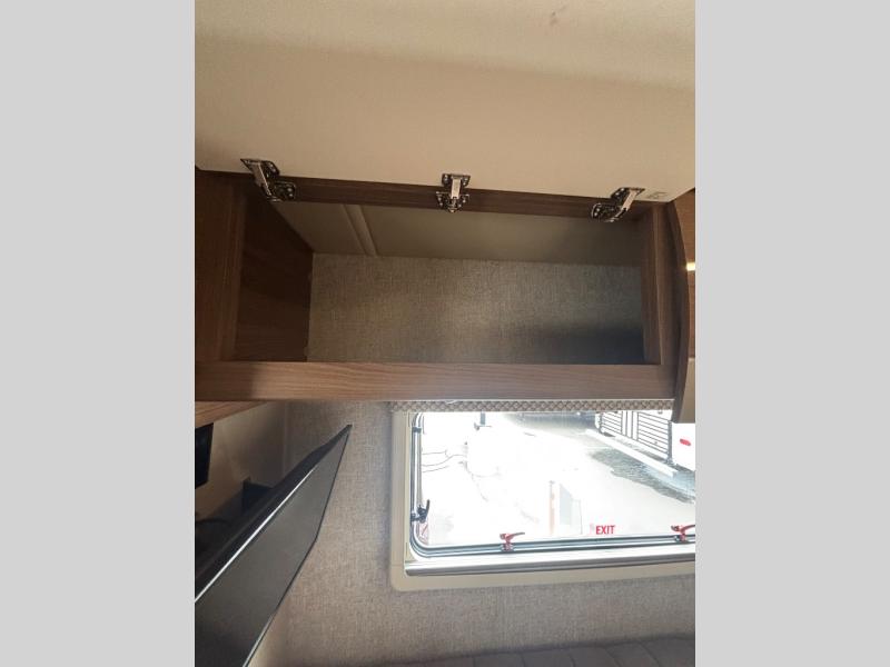 Step inside just behind the front passenger seat. Notice how both driver and passenger seat can swivel around creating additional seating space once parked. There is overhead storage on both sides of the cab area, or you can opt. for a cabover bunk that is 49" x 75", which easily makes room for one additional guest to sleep.