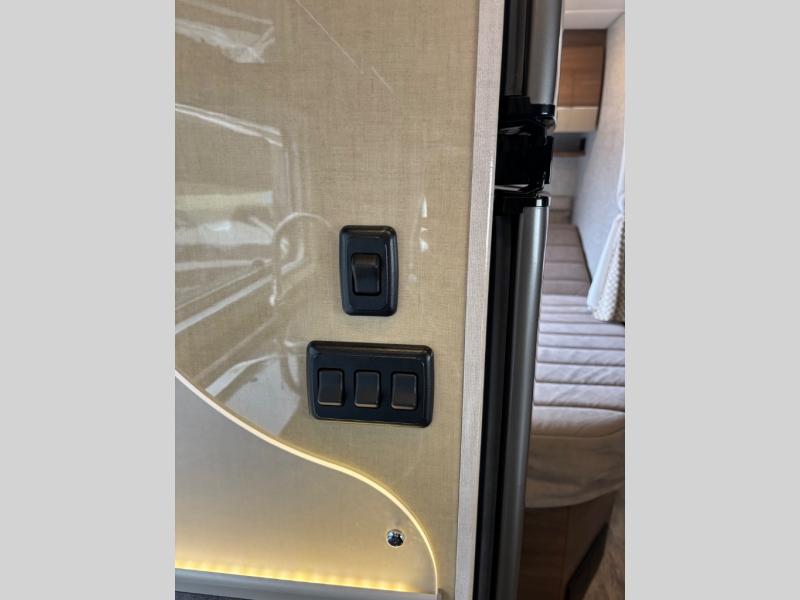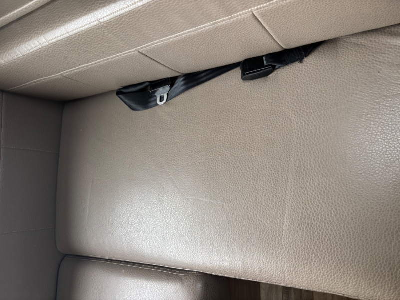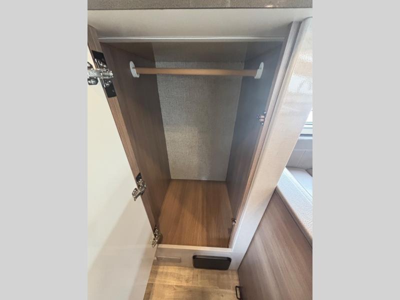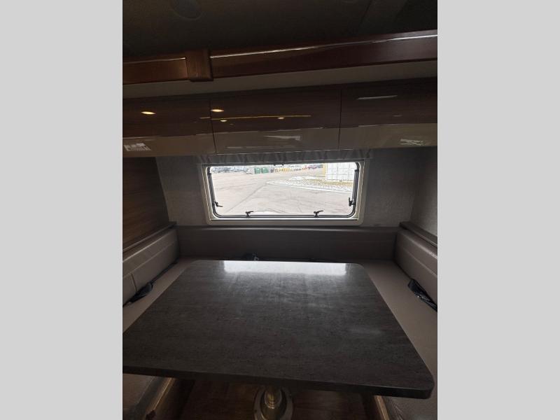 Straight ahead as you enter there is a slide out wardrobe and u-shaped dinette with footrests on either end. Travel safely with three sets of seat belts attached to the dinette seating for rear travelers. There is also a 42" x 82" dining table that is perfect for enjoying a meal at.