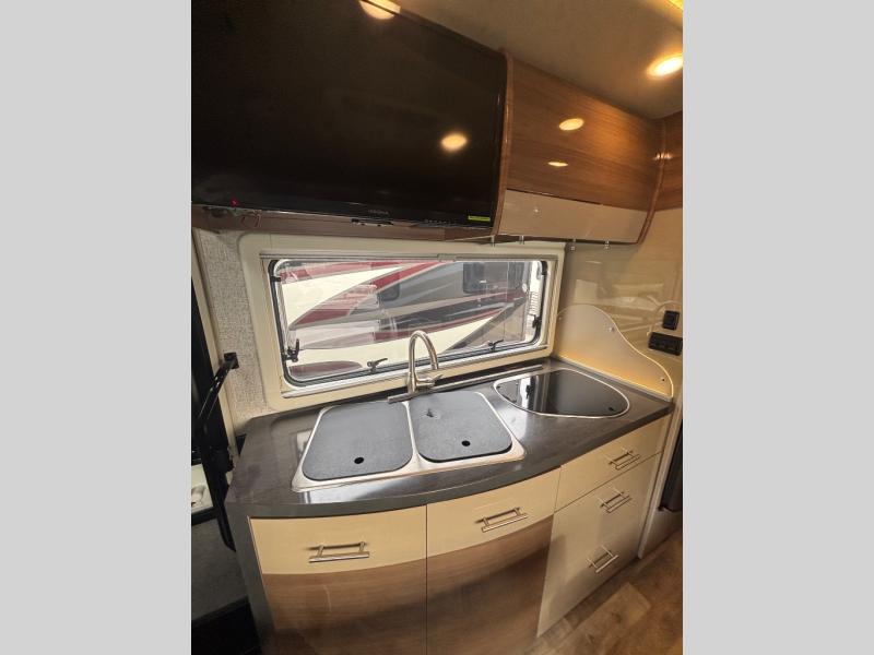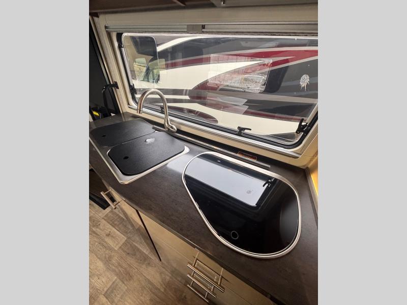 To the left of the entrance find all the kitchen amenities needed to create meals and snacks while you are on the road. There is a double sink, a two burner range top, overhead cabinets, and a refrigerator to keep your food items cold and fresh. The 28" HDTV is also located above the kitchen area which can easily be viewed from the dinette or front captain's chairs.