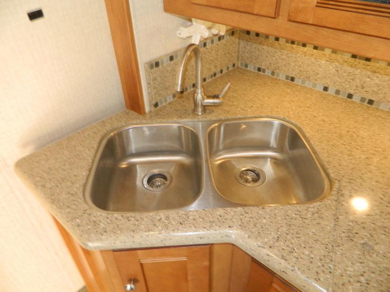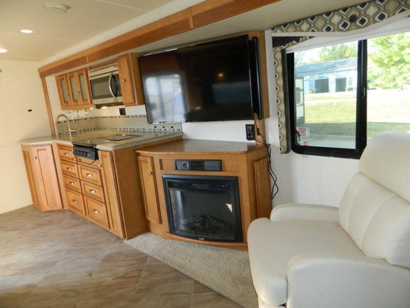 Step inside and find a large slide out inLounge to your right featuring seat belts, and the ability to extend for added seating. There is a slide opposite that features a recliner, and 48" HDTV with electric fireplace below. You will also find in this large slide out part of the kitchen area which includes overhead storage, counter space, a three burner range, and a double kitchen sink. The 4-door refrigerator/freezer is opposite just to the left of the main entrance.