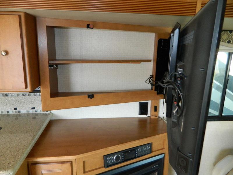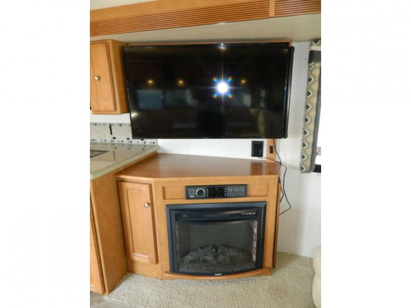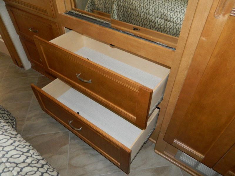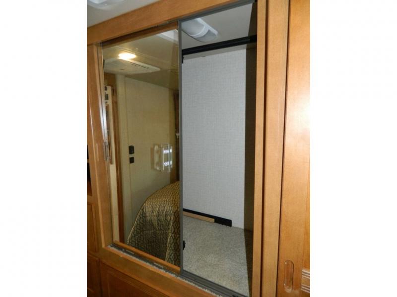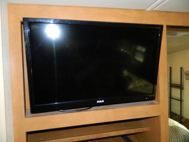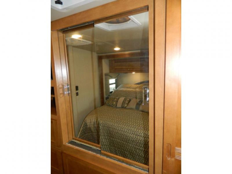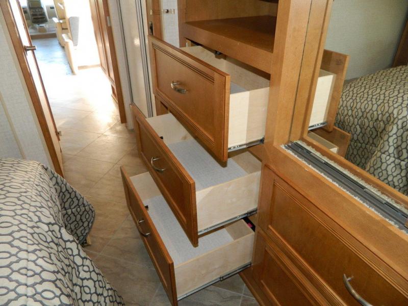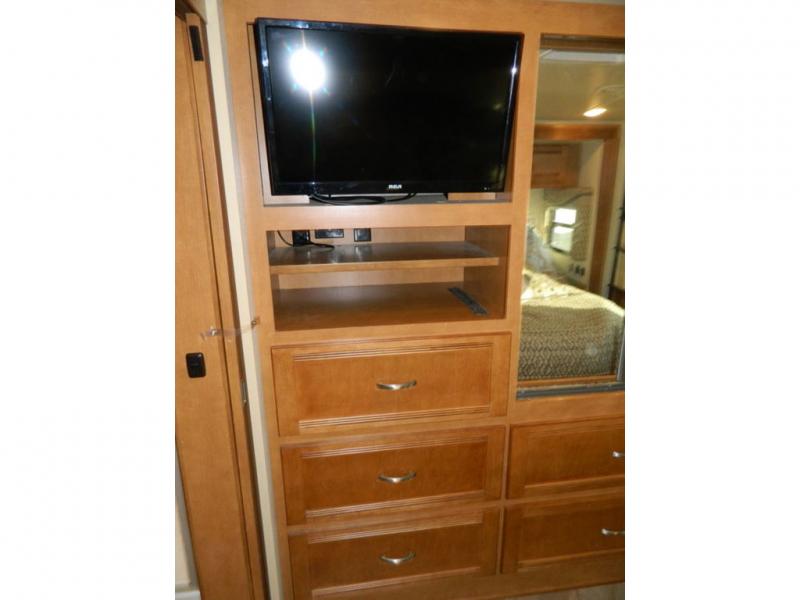 A second sliding door separates the bathroom from the bedroom and features a Recline/Incline queen size bed slide with nightstands along the road side. On the opposite side there is a wardrobe, a chest of drawers along with a 28" HDTV above, and a storage cabinet that can also be used as the location for a washer and dryer if you wish to add! A great feature that means no mountain of dirty laundry when you return home!