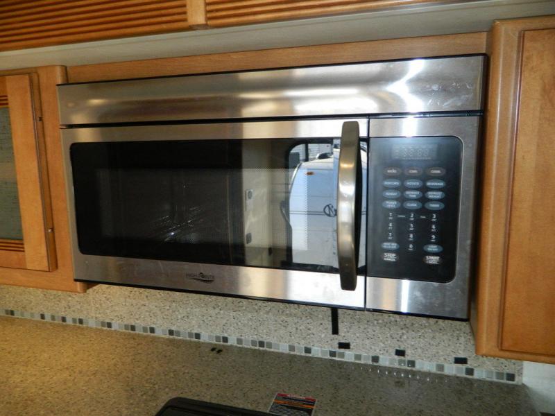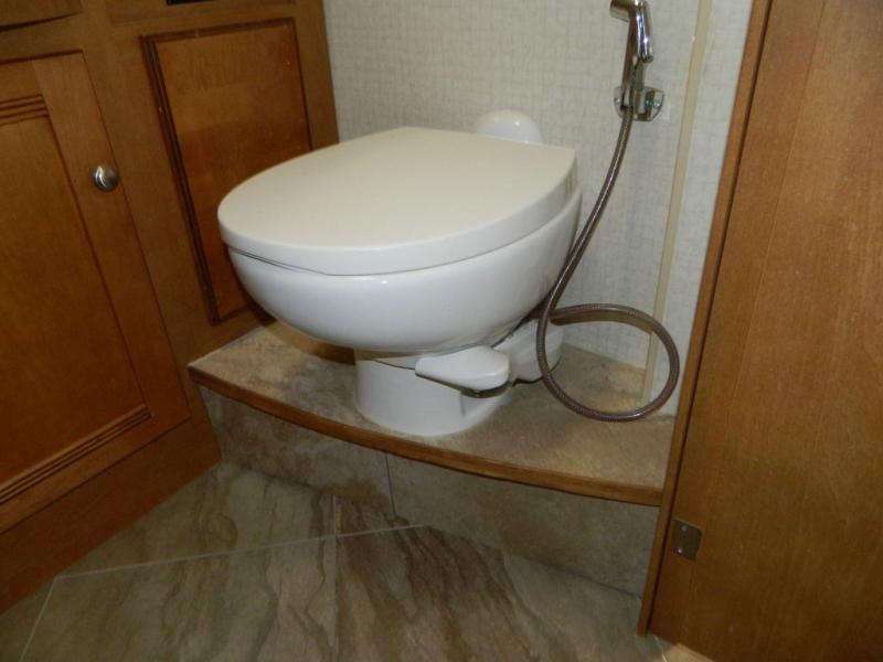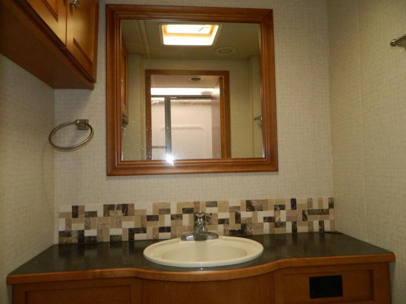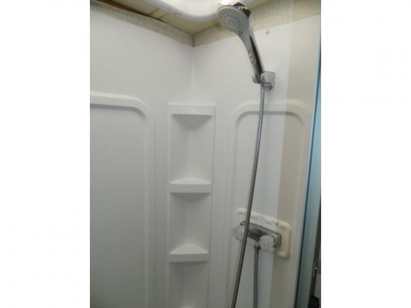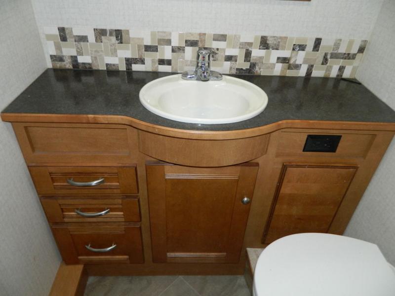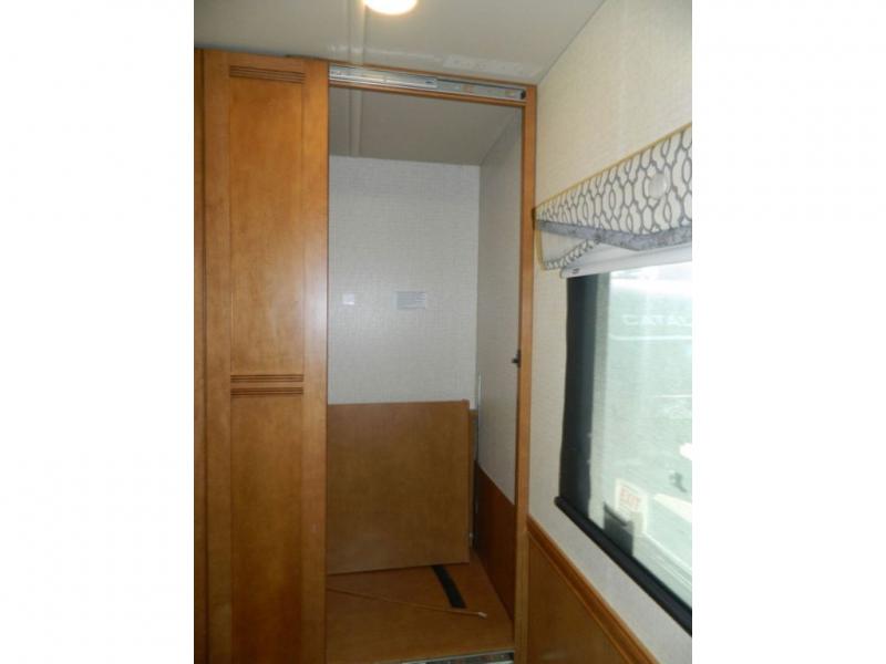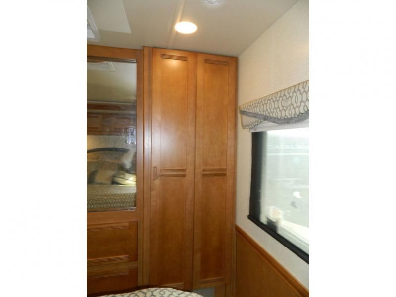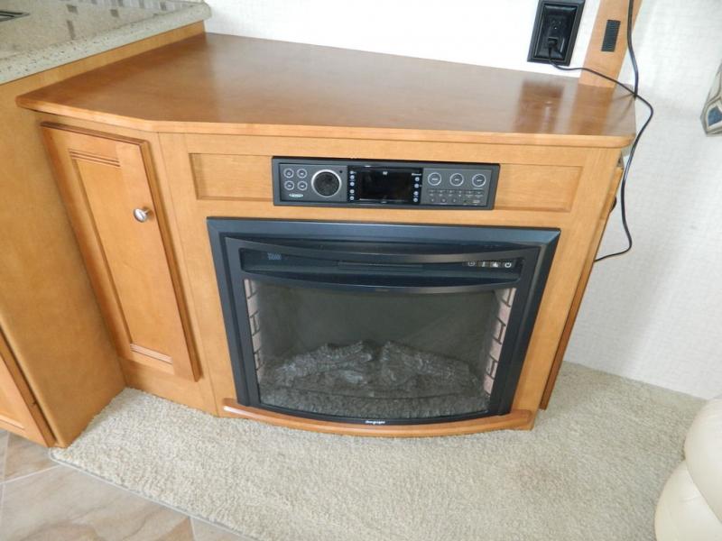A second sliding door separates the bathroom from the bedroom and features a Recline/Incline queen size bed slide with nightstands along the road side. On the opposite side there is a wardrobe, a chest of drawers along with a 28" HDTV above, and a storage cabinet that can also be used as the location for a washer and dryer if you wish to add! A great feature that means no mountain of dirty laundry when you return home!