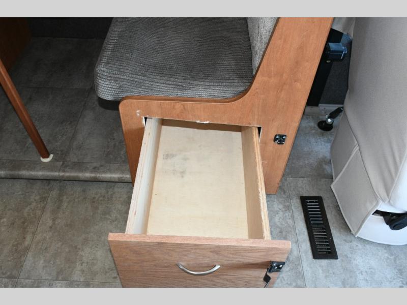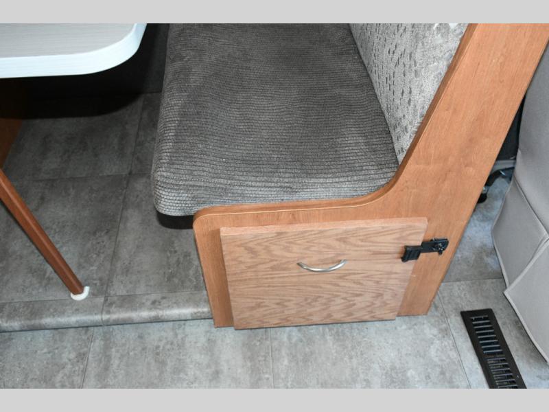 Seat-belted booth dinette allows passengers to ride safely and comfortably