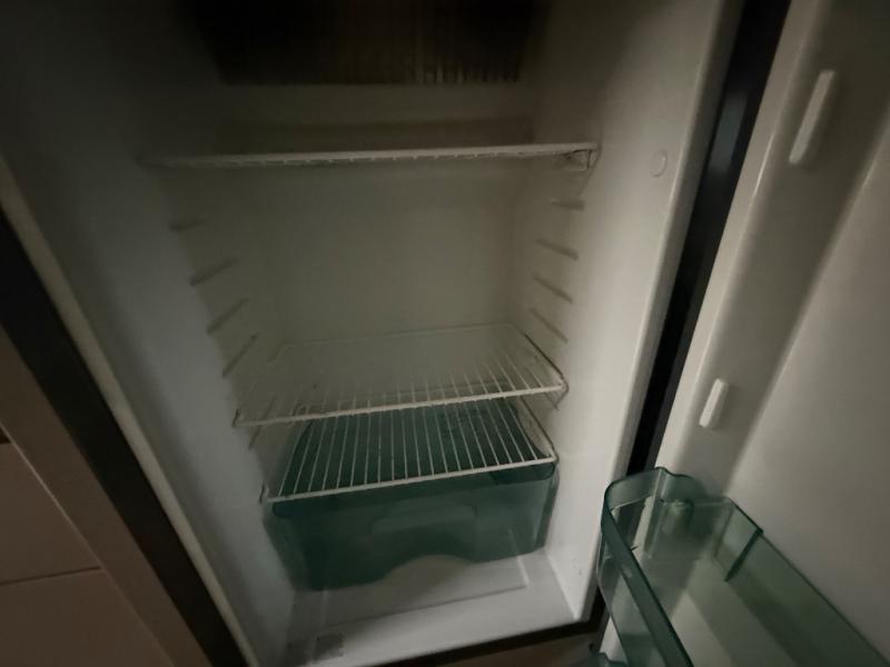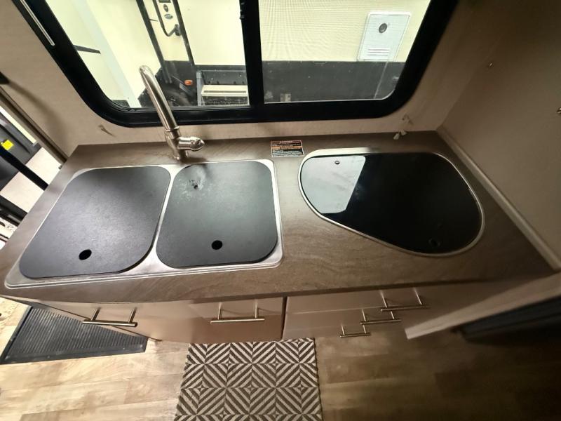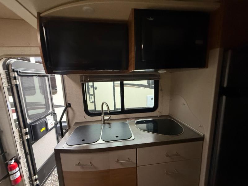 The kitchen area is to the left of the entry door and features a double sink, a two burner cook-top, and refrigerator. You will find a 28" HDTV mounted above the sink location.