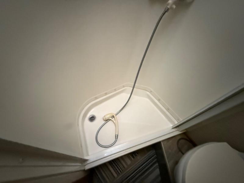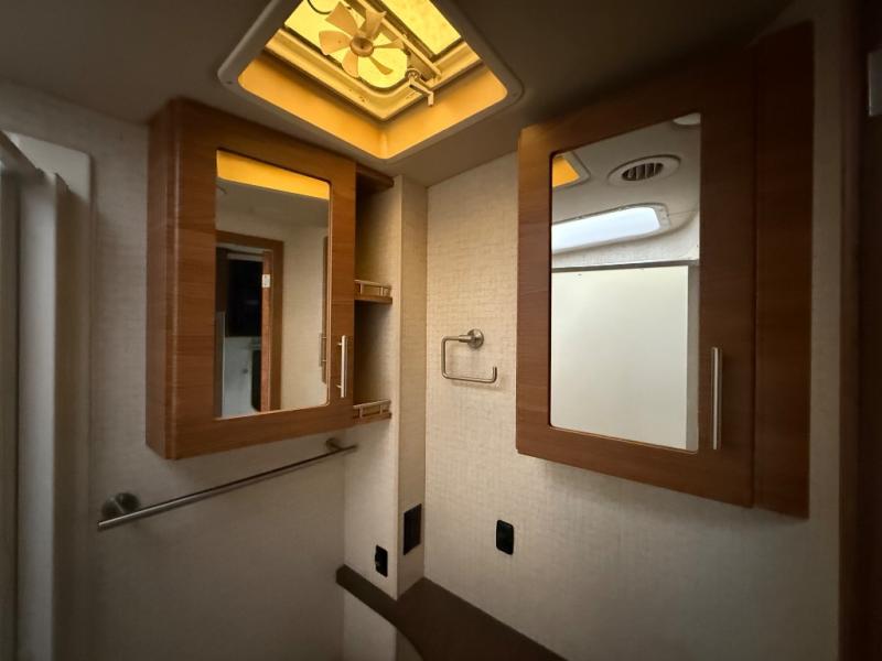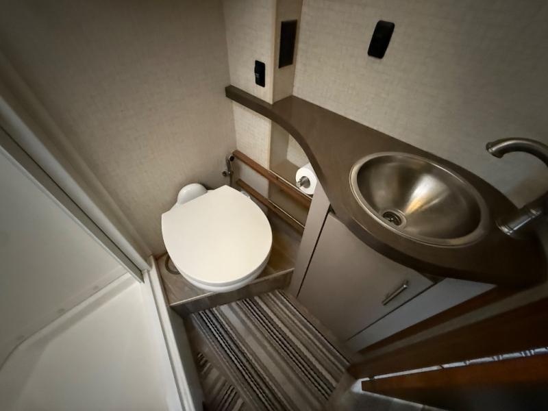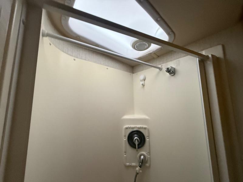 Beyond the sofa heading toward the rear of the coach you will find a side bath with corner shower, toilet, and vanity with round sink including a medicine cabinet overhead. A nice size wardrobe is found across from the bath before the rear sleeping area along the curb side wall.